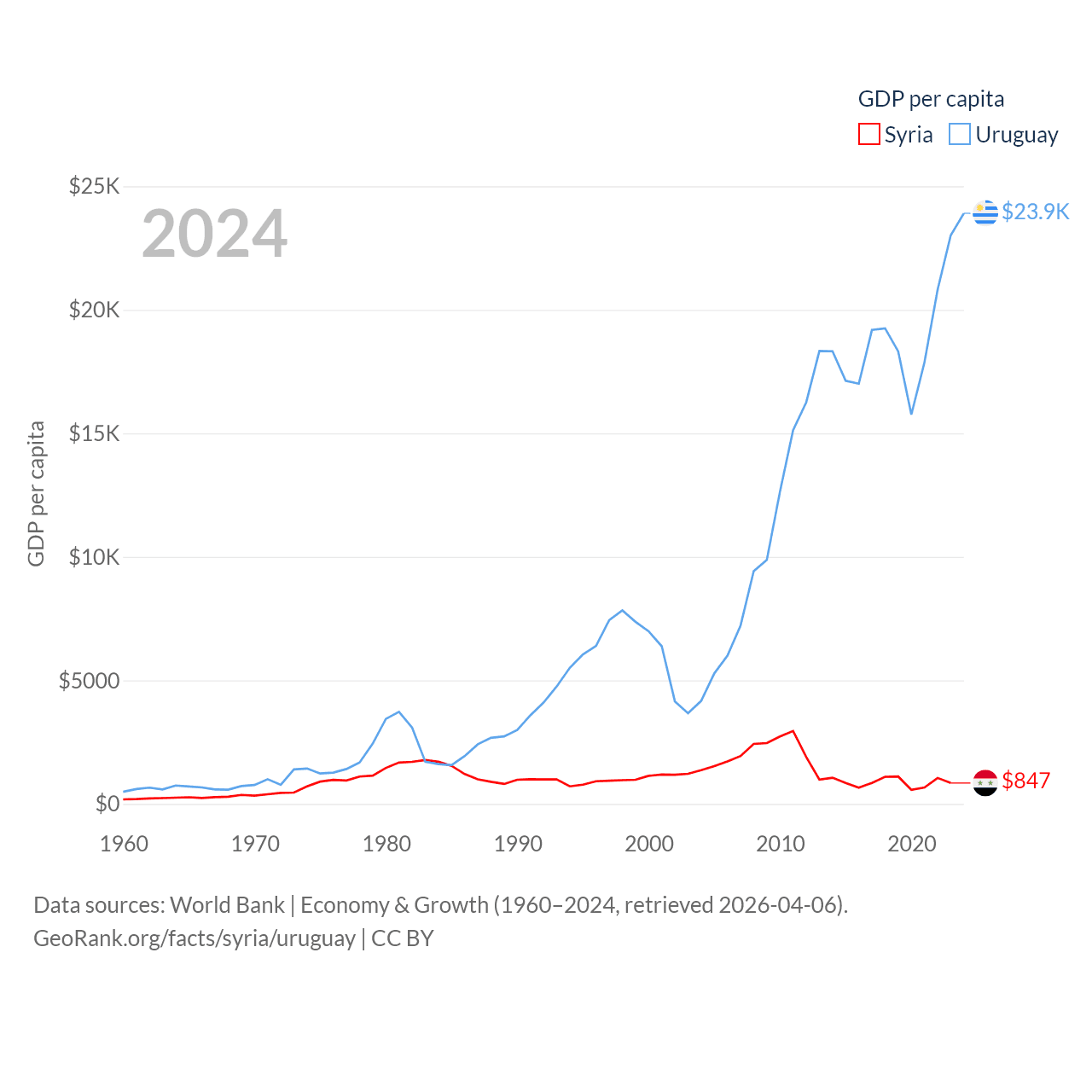 By GDP, Syria ranks 129/197 ($20B) and Uruguay ranks 81/197 ($81B). By GDP per capita, Syria ranks 185/197 ($847), while Uruguay ranks 52/197 ($23,907).