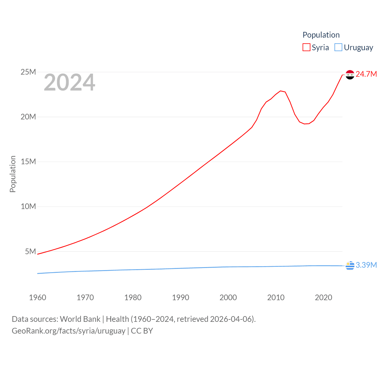 Syria has a population of 24.7M (ranked 57/197), compared with 3.39M in Uruguay (ranked 133/197). Syria's land area is 70,900 sq mi versus 67,576 sq mi for Uruguay (ranked 87th vs. 89th).