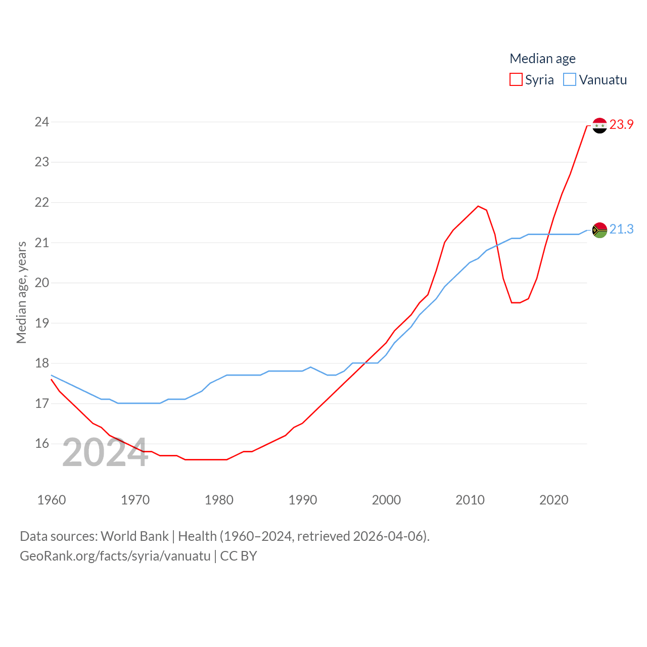Syria has a population of 24.7M (ranked 57/197), compared with 328K in Vanuatu (ranked 174/197). Syria's land area is 70,900 sq mi versus 4,707 sq mi for Vanuatu (ranked 87th vs. 157th).
