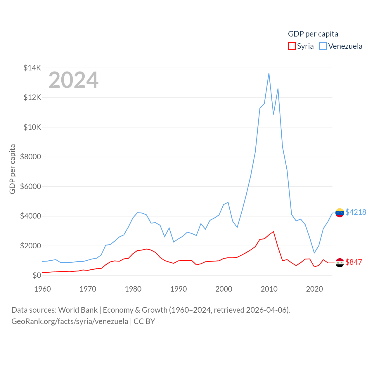 By GDP, Syria ranks 129/197 ($20B) and Venezuela ranks 65/197 ($120B). By GDP per capita, Syria ranks 185/197 ($847), while Venezuela ranks 128/197 ($4,218).