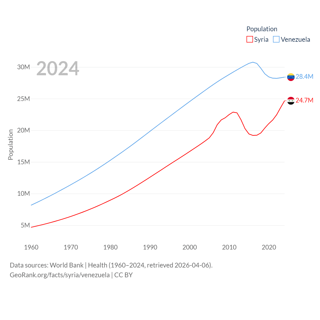 Syria has a population of 24.7M (ranked 57/197), compared with 28.4M in Venezuela (ranked 53/197). Syria's land area is 70,900 sq mi versus 340,561 sq mi for Venezuela (ranked 87th vs. 32nd).