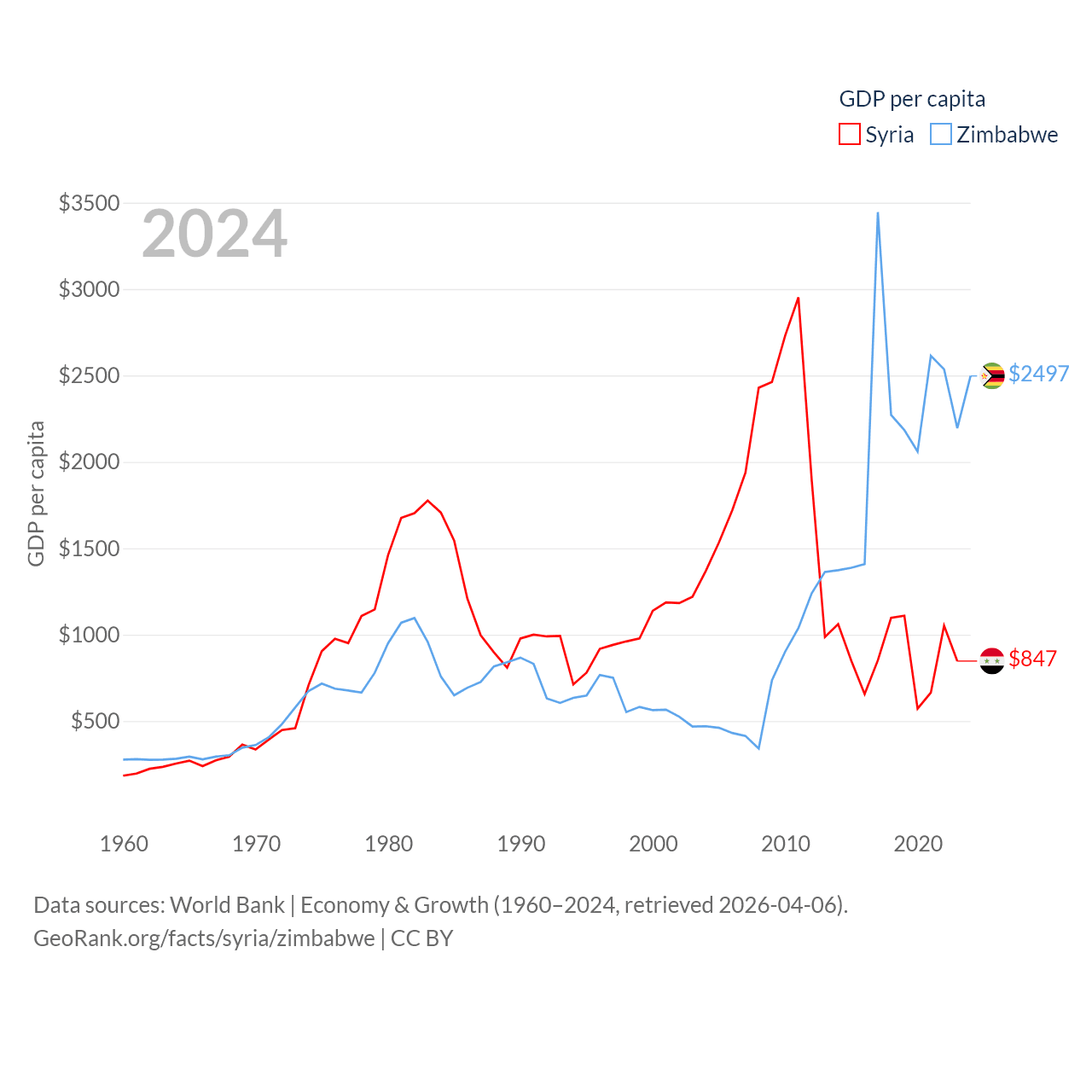 By GDP, Syria ranks 129/197 ($20B) and Zimbabwe ranks 102/197 ($41.5B). By GDP per capita, Syria ranks 185/197 ($847), while Zimbabwe ranks 148/197 ($2,497).