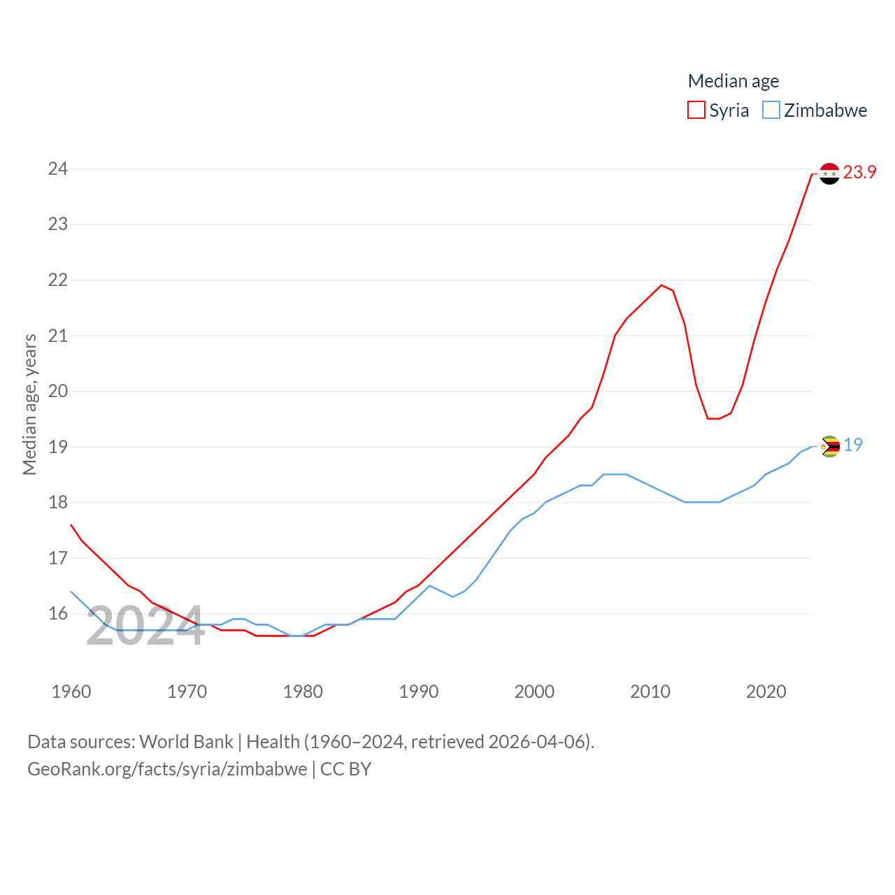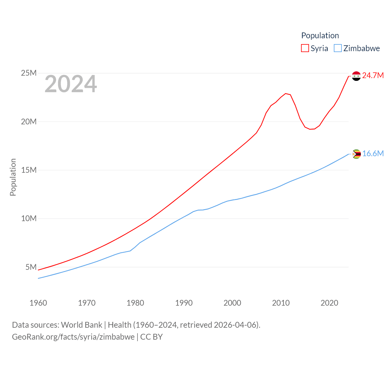 Syria has a population of 24.7M (ranked 57/197), compared with 16.6M in Zimbabwe (ranked 74/197). Syria's land area is 70,900 sq mi versus 149,364 sq mi for Zimbabwe (ranked 87th vs. 60th).