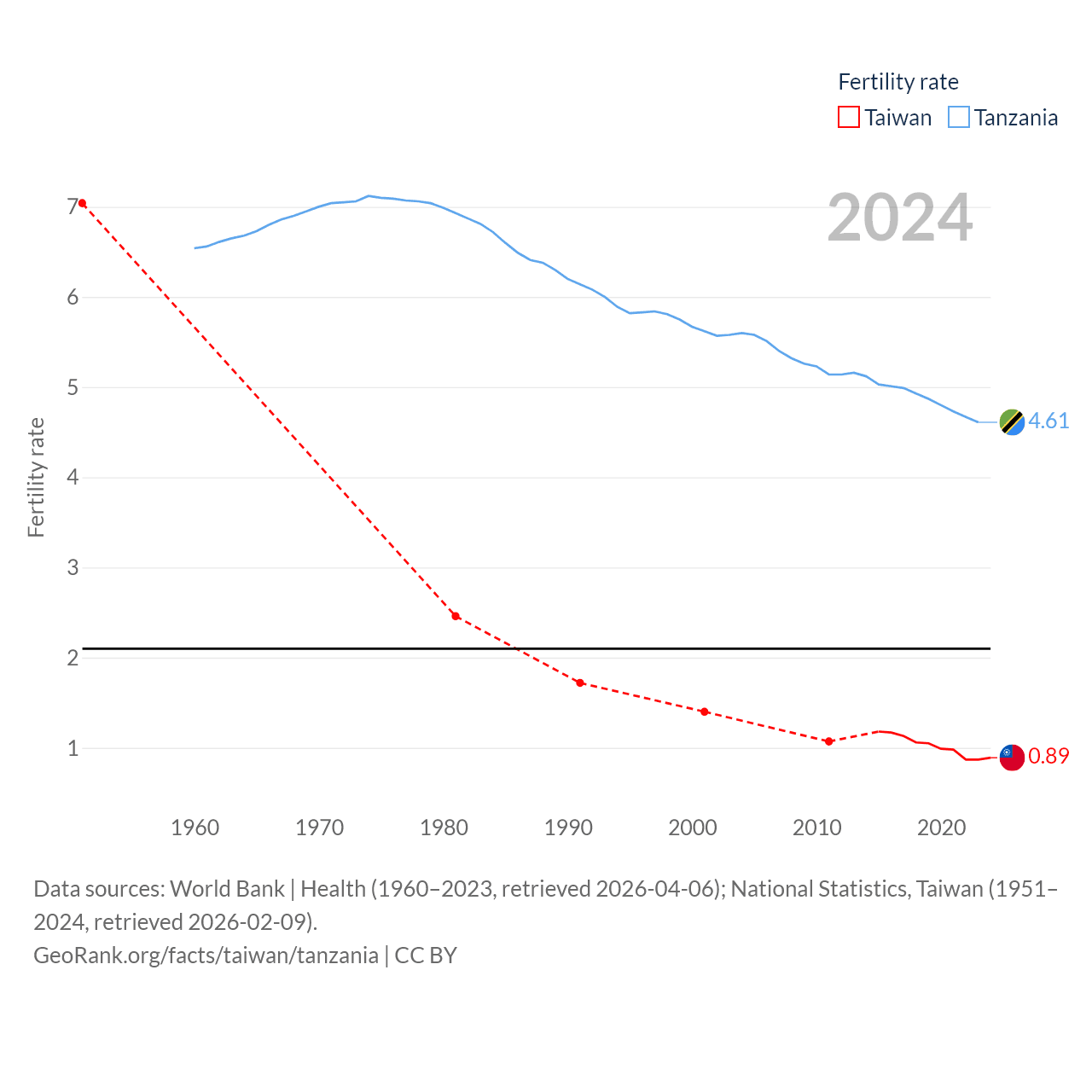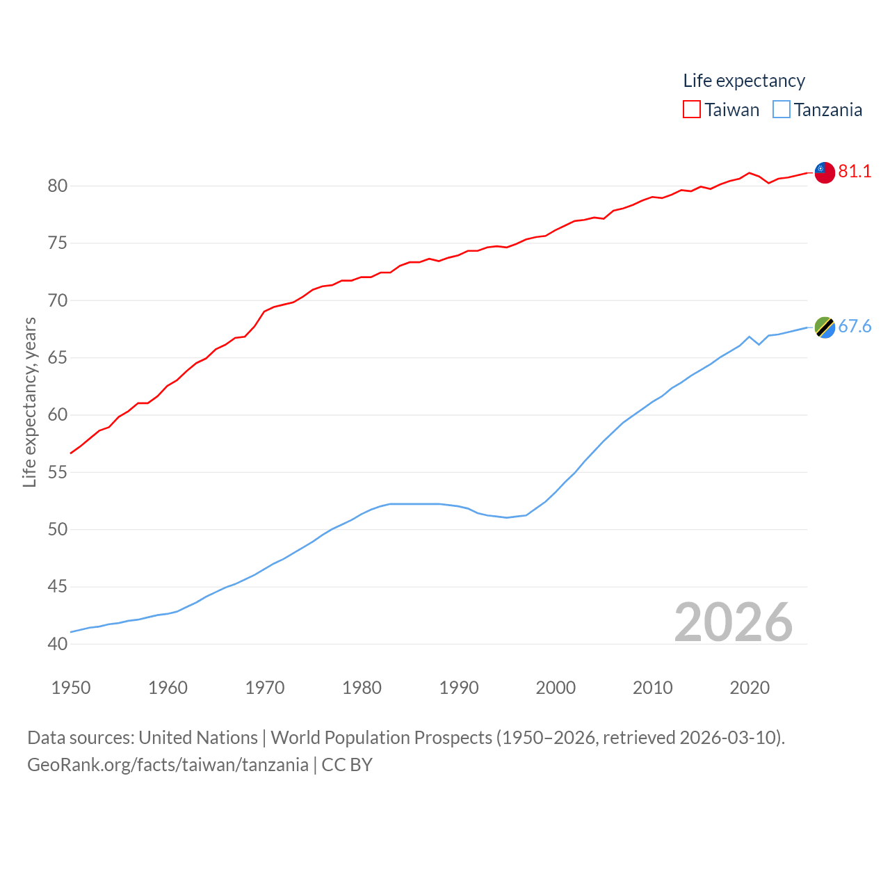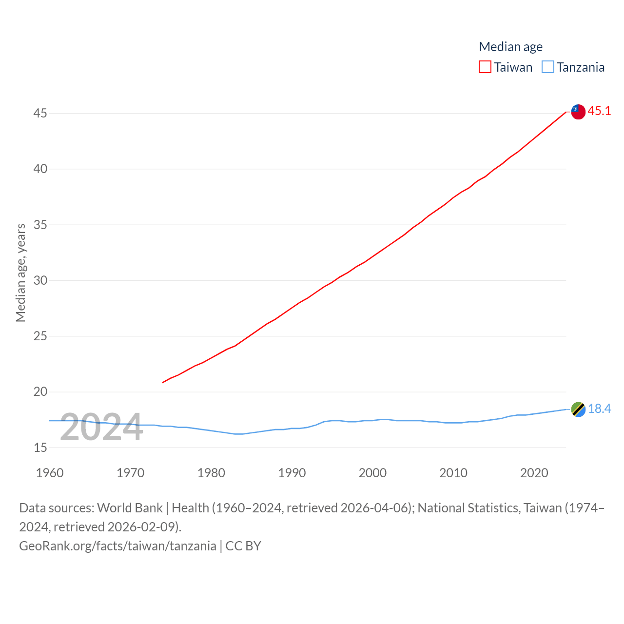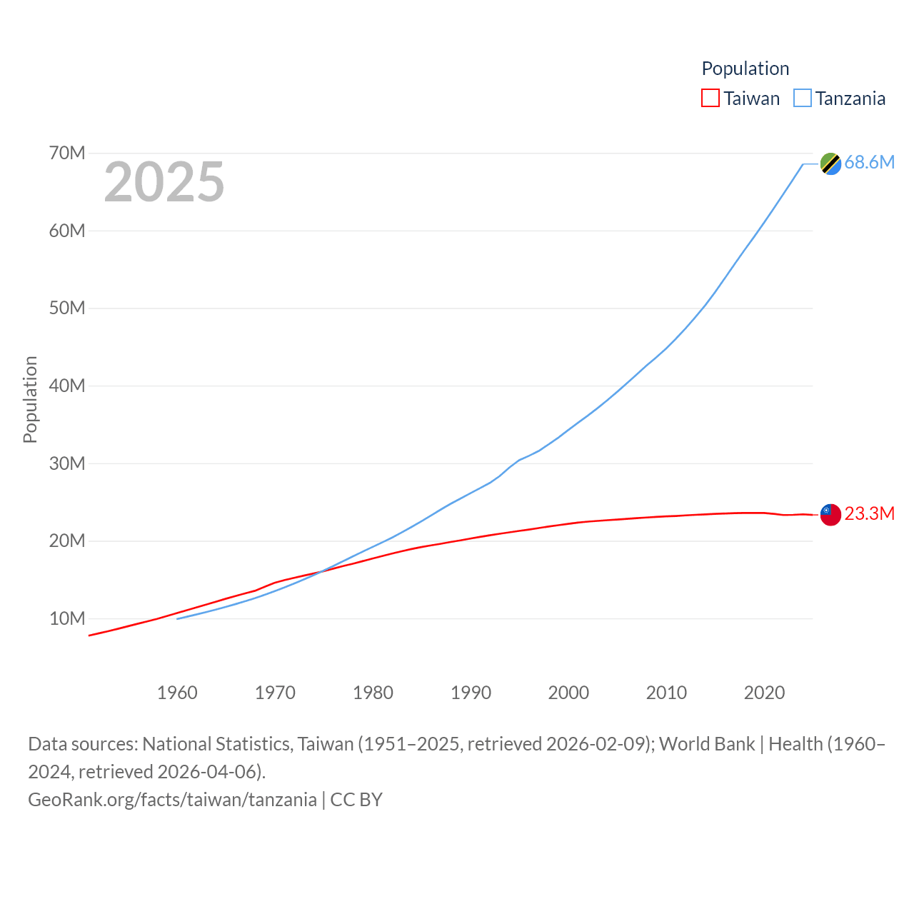 Taiwan has a population of 23.3M (ranked 60/197), compared with 68.6M in Tanzania (ranked 22/197). Taiwan's land area is 13,976 sq mi versus 342,009 sq mi for Tanzania (ranked 133rd vs. 31st).