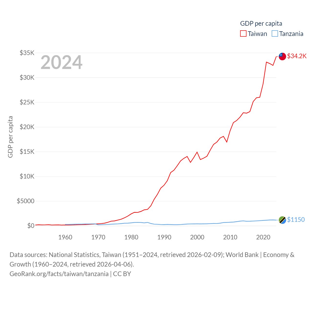 By GDP, Taiwan ranks 22/197 ($802B) and Tanzania ranks 82/197 ($78.8B). By GDP per capita, Taiwan ranks 35/197 ($34,238), while Tanzania ranks 170/197 ($1,150).
