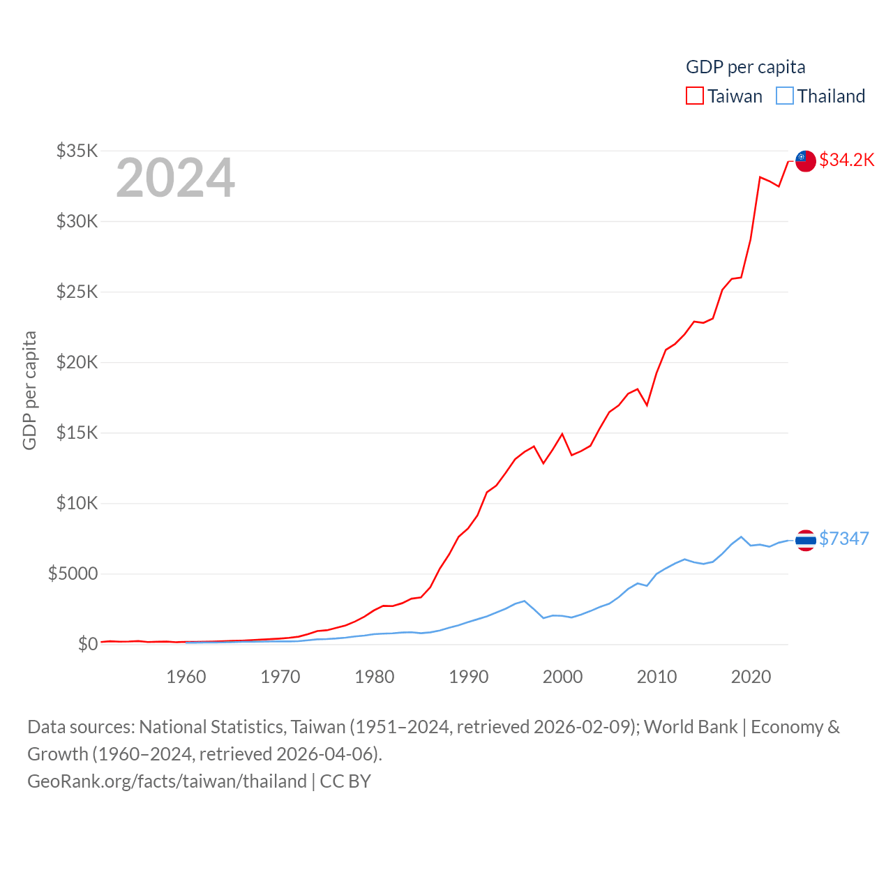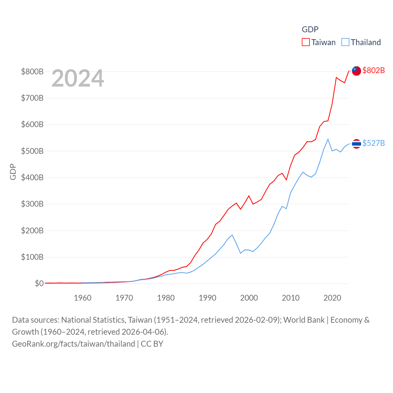 By GDP, Taiwan ranks 22/197 ($802B) and Thailand ranks 31/197 ($527B). By GDP per capita, Taiwan ranks 35/197 ($34,238), while Thailand ranks 100/197 ($7,347).