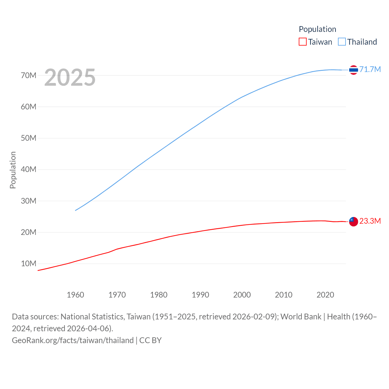 Taiwan has a population of 23.3M (ranked 60/197), compared with 71.7M in Thailand (ranked 20/197). Taiwan's land area is 13,976 sq mi versus 197,256 sq mi for Thailand (ranked 133rd vs. 50th).