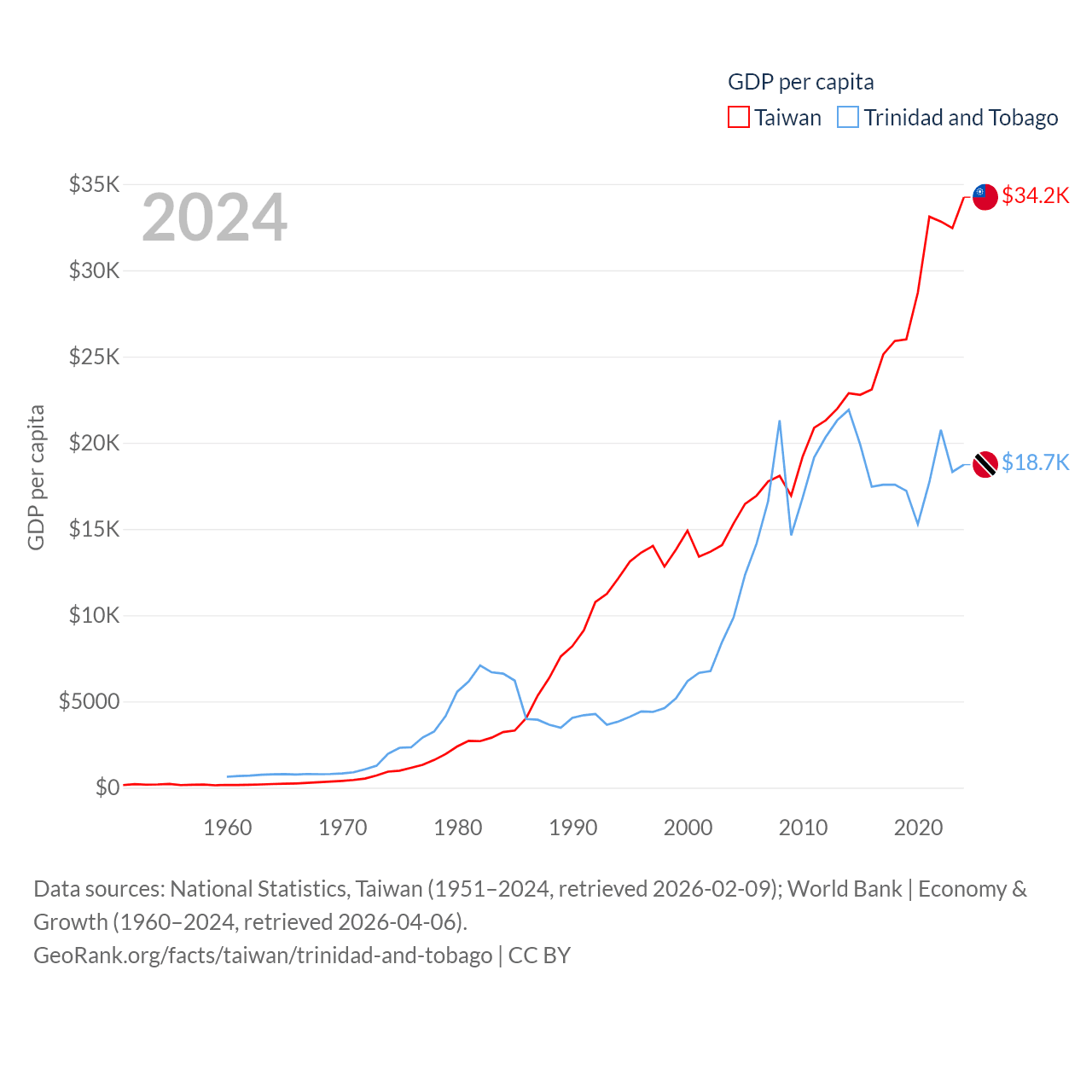 By GDP, Taiwan ranks 22/197 ($802B) and Trinidad and Tobago ranks 115/197 ($25.6B). By GDP per capita, Taiwan ranks 35/197 ($34,238), while Trinidad and Tobago ranks 61/197 ($18,733).