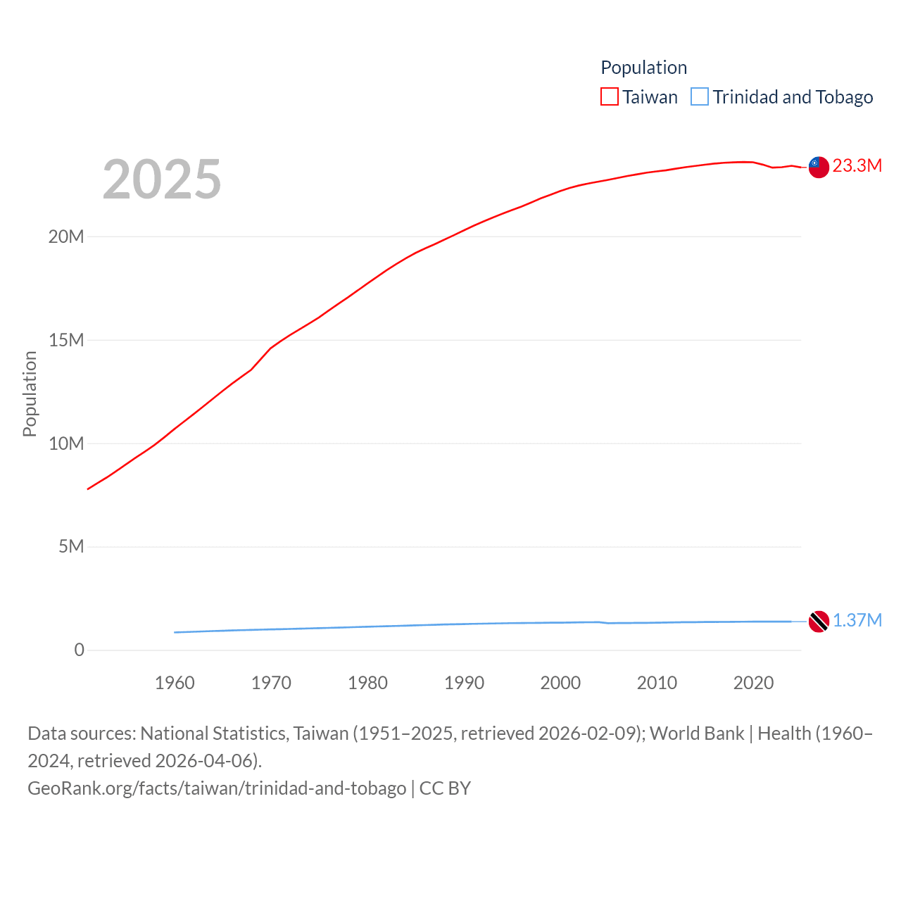 Taiwan has a population of 23.3M (ranked 60/197), compared with 1.37M in Trinidad and Tobago (ranked 154/197). Taiwan's land area is 13,976 sq mi versus 1,981 sq mi for Trinidad and Tobago (ranked 133rd vs. 166th).