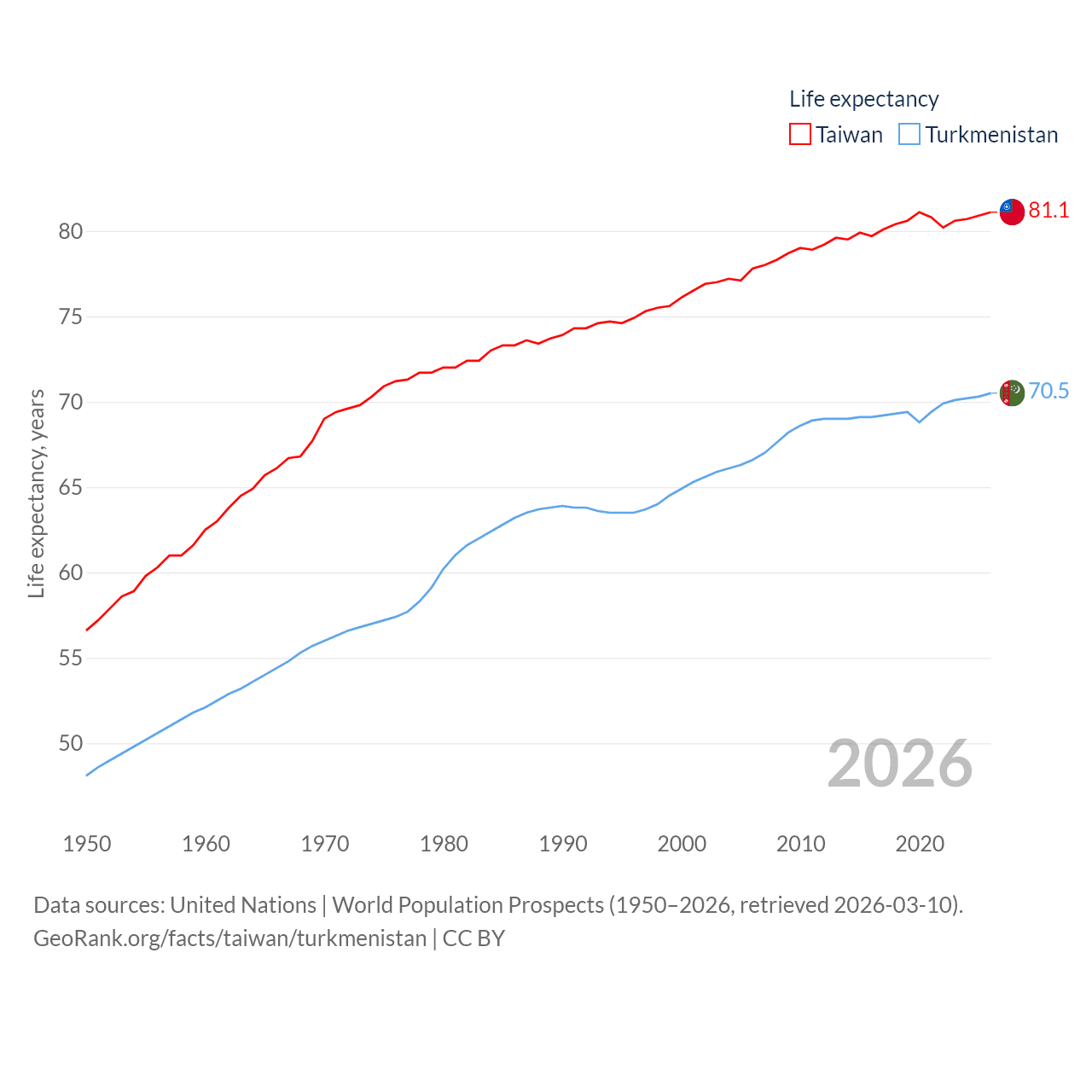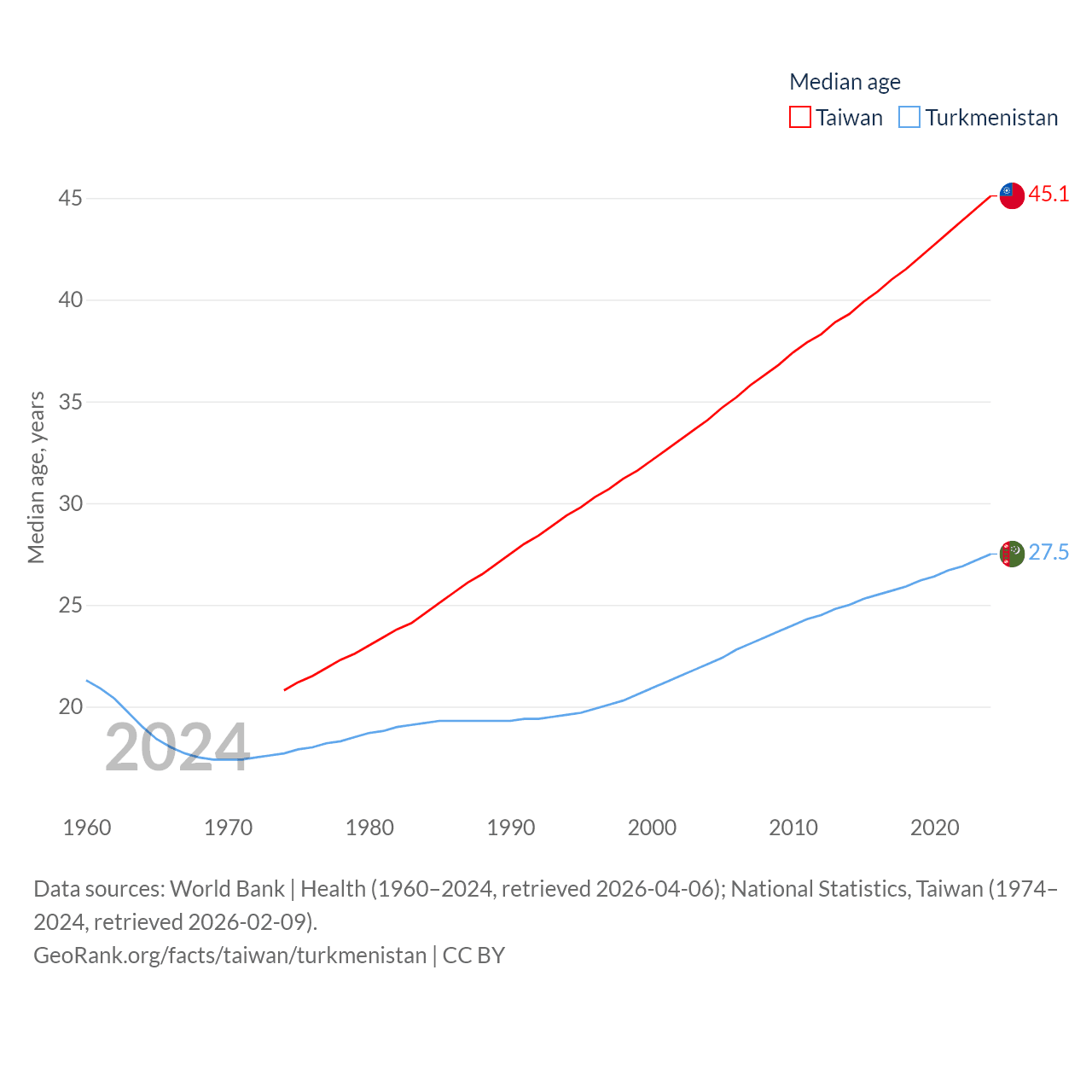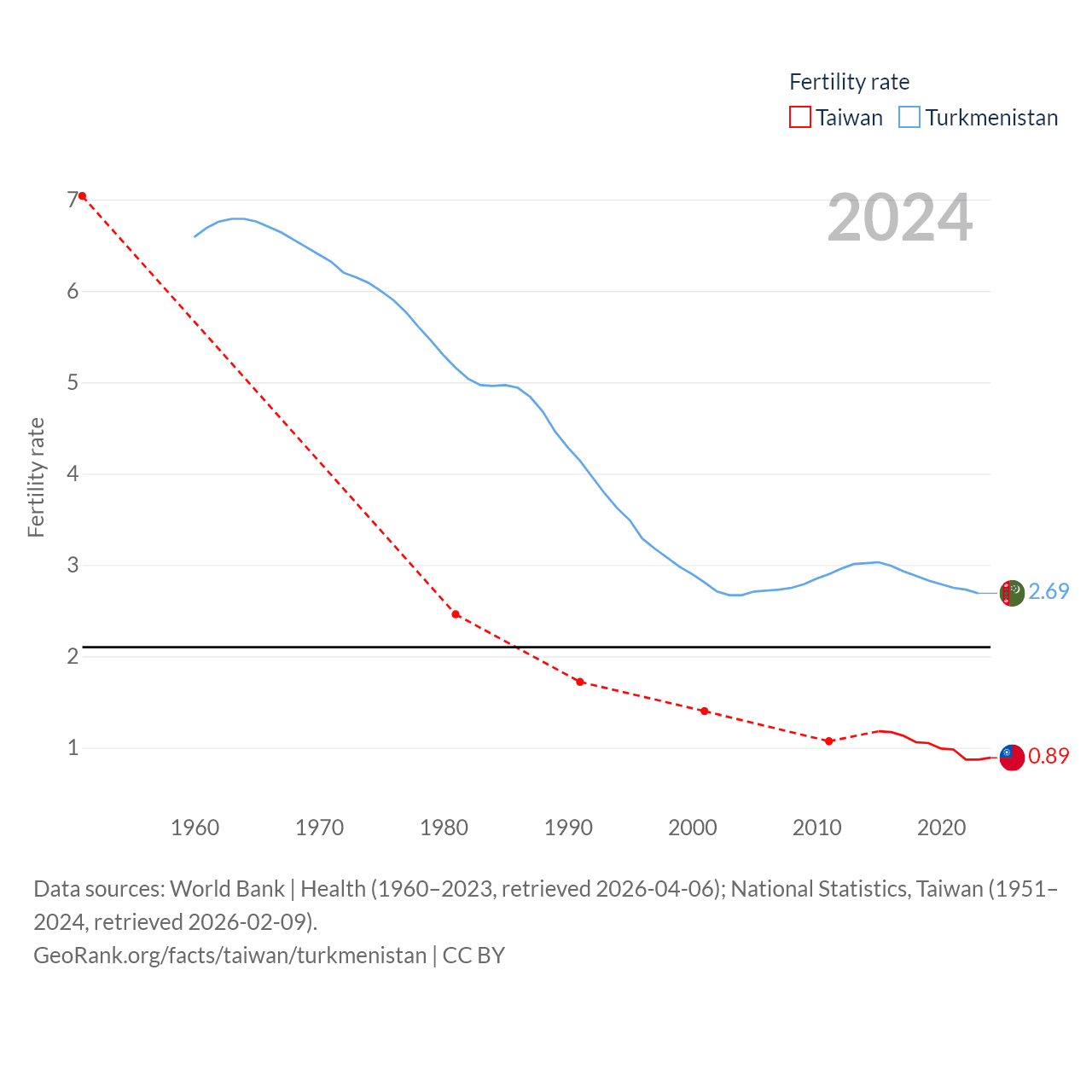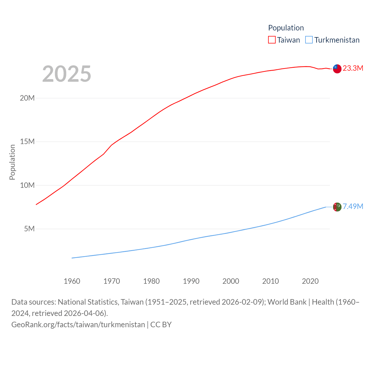 Taiwan has a population of 23.3M (ranked 60/197), compared with 7.49M in Turkmenistan (ranked 104/197). Taiwan's land area is 13,976 sq mi versus 181,441 sq mi for Turkmenistan (ranked 133rd vs. 53rd).