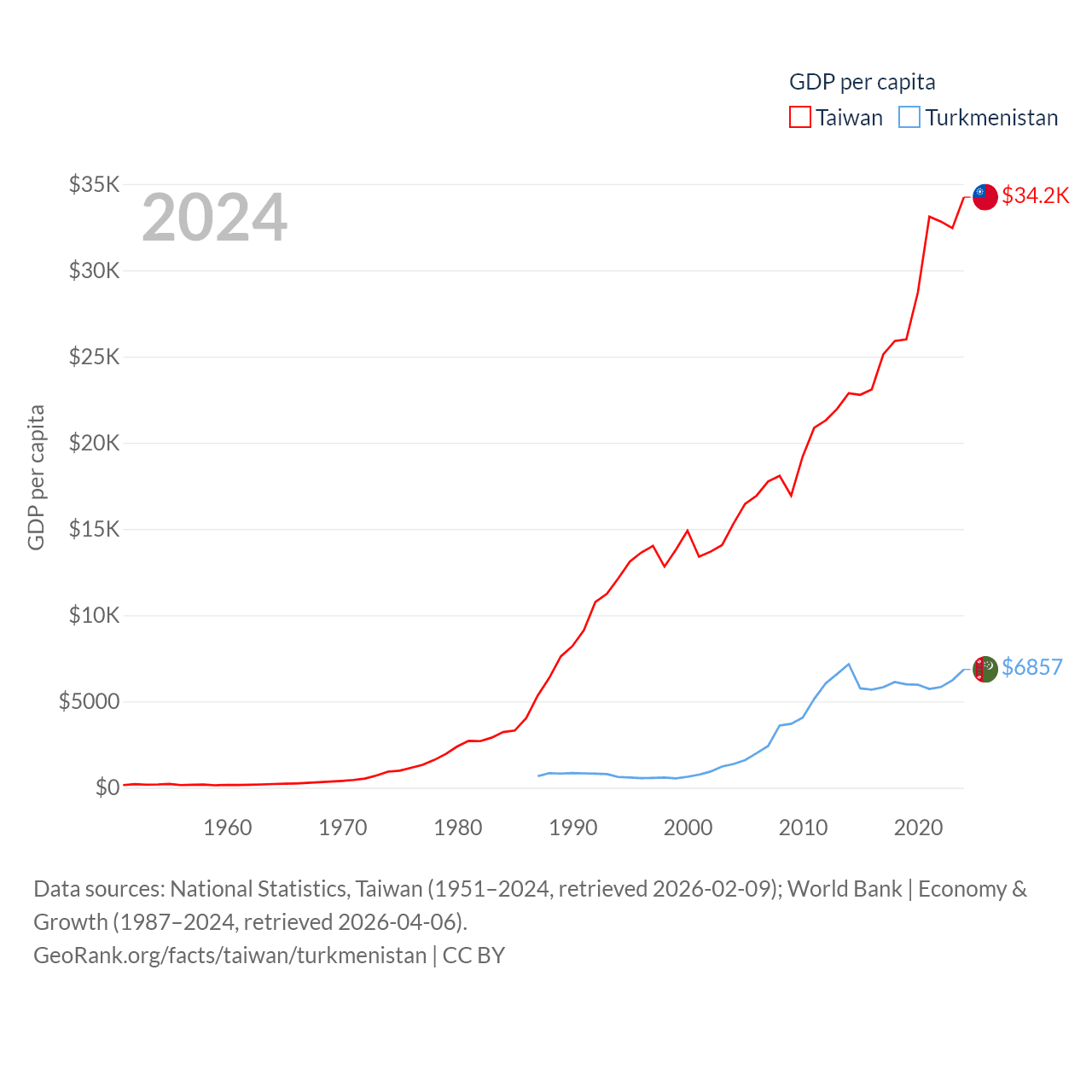 By GDP, Taiwan ranks 22/197 ($802B) and Turkmenistan ranks 92/197 ($51.4B). By GDP per capita, Taiwan ranks 35/197 ($34,238), while Turkmenistan ranks 104/197 ($6,857).