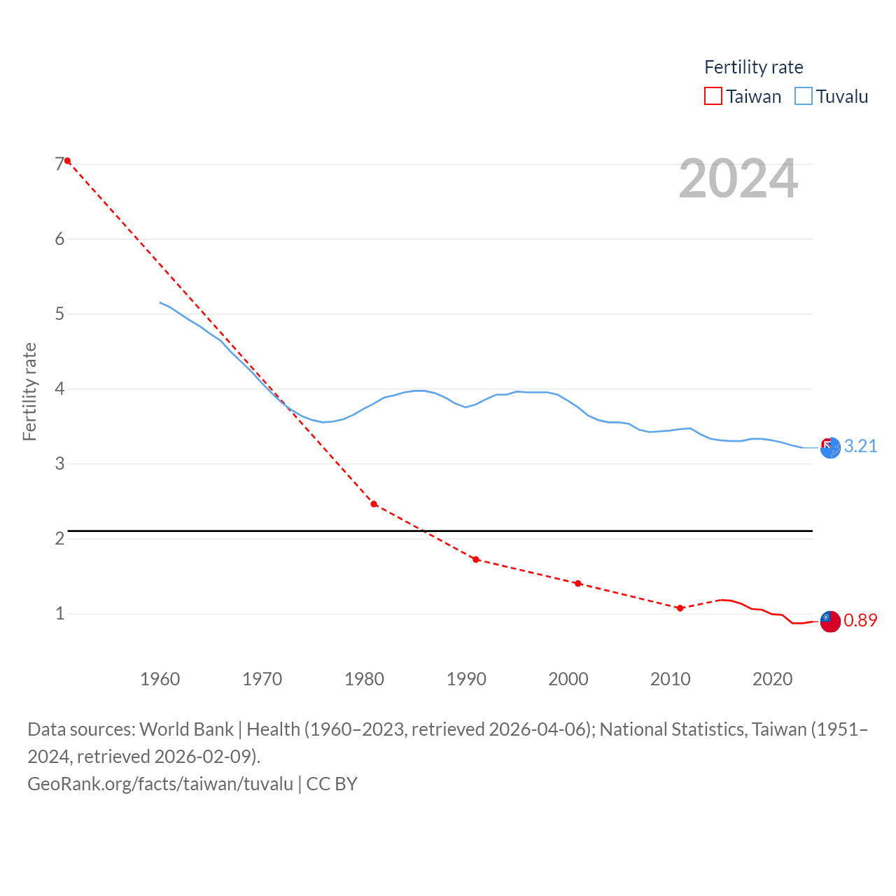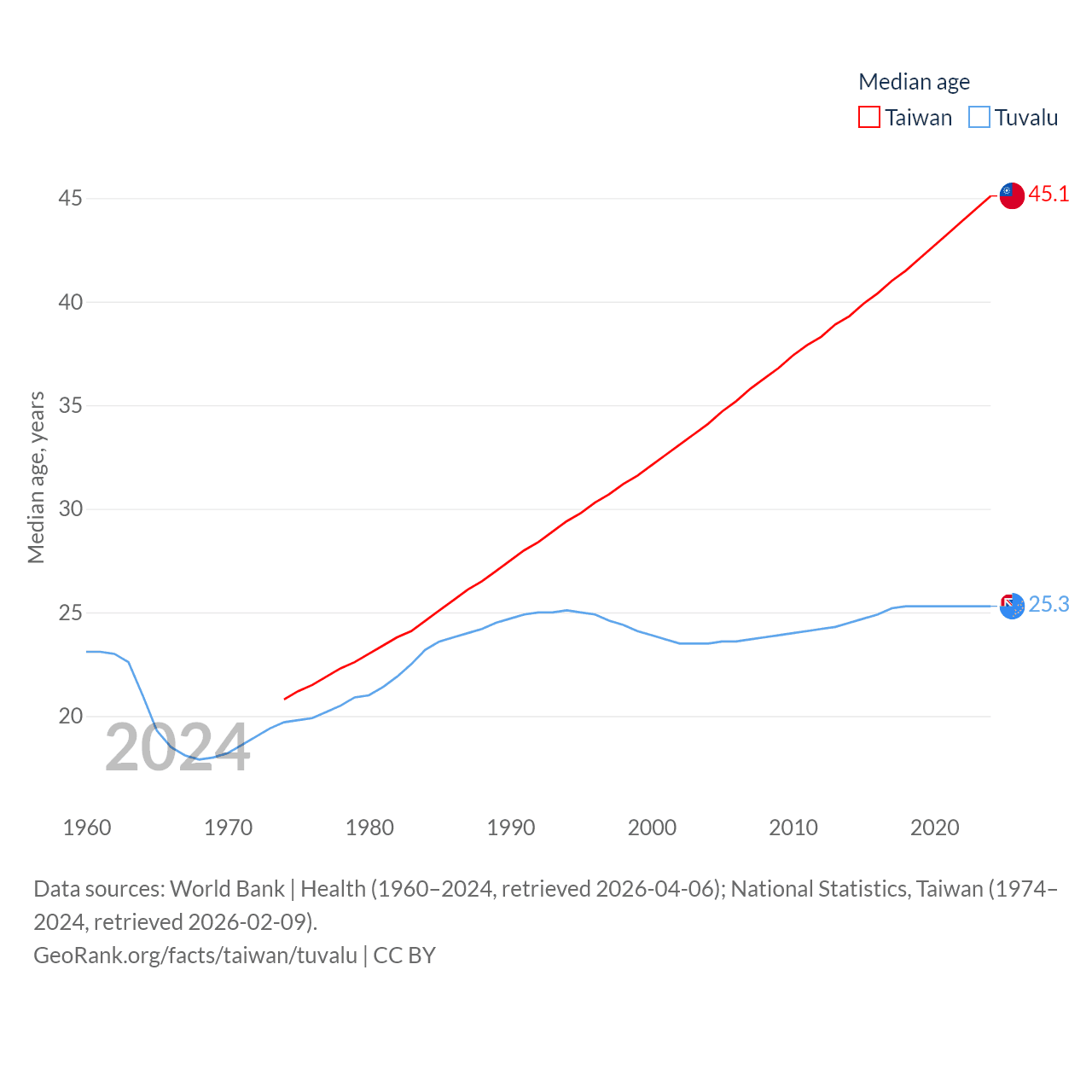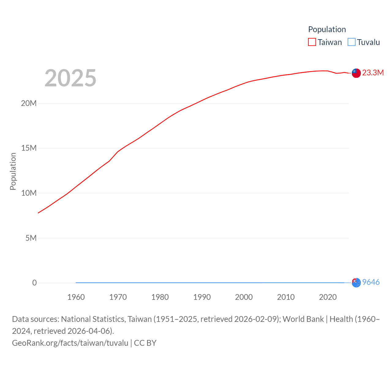 Taiwan has a population of 23.3M (ranked 60/197), compared with 9.65K in Tuvalu (ranked 196/197). Taiwan's land area is 13,976 sq mi versus 11.6 sq mi for Tuvalu (ranked 133rd vs. 194th).