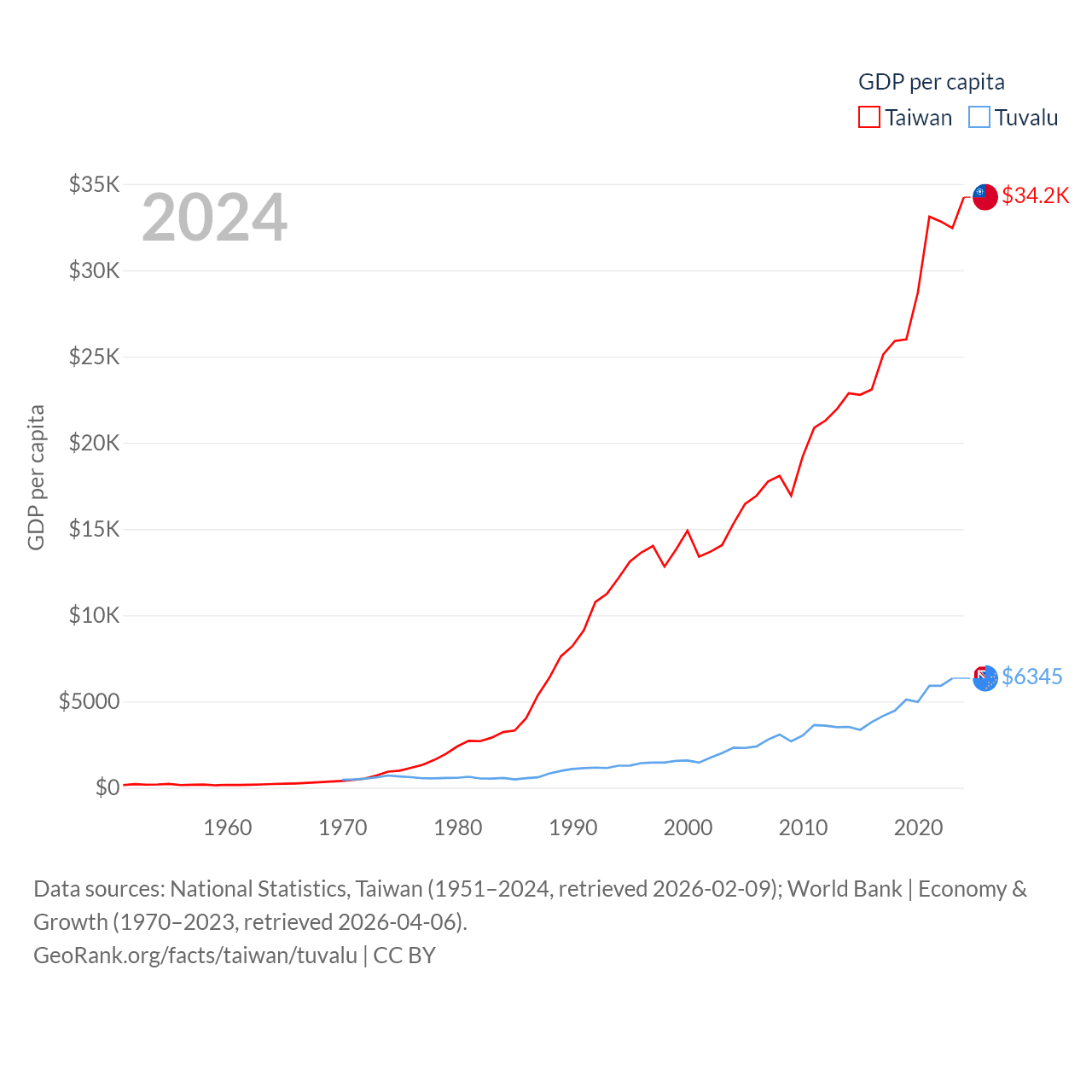 By GDP, Taiwan ranks 22/197 ($802B) and Tuvalu ranks 196/197 ($62.3M). By GDP per capita, Taiwan ranks 35/197 ($34,238), while Tuvalu ranks 110/197 ($6,345).