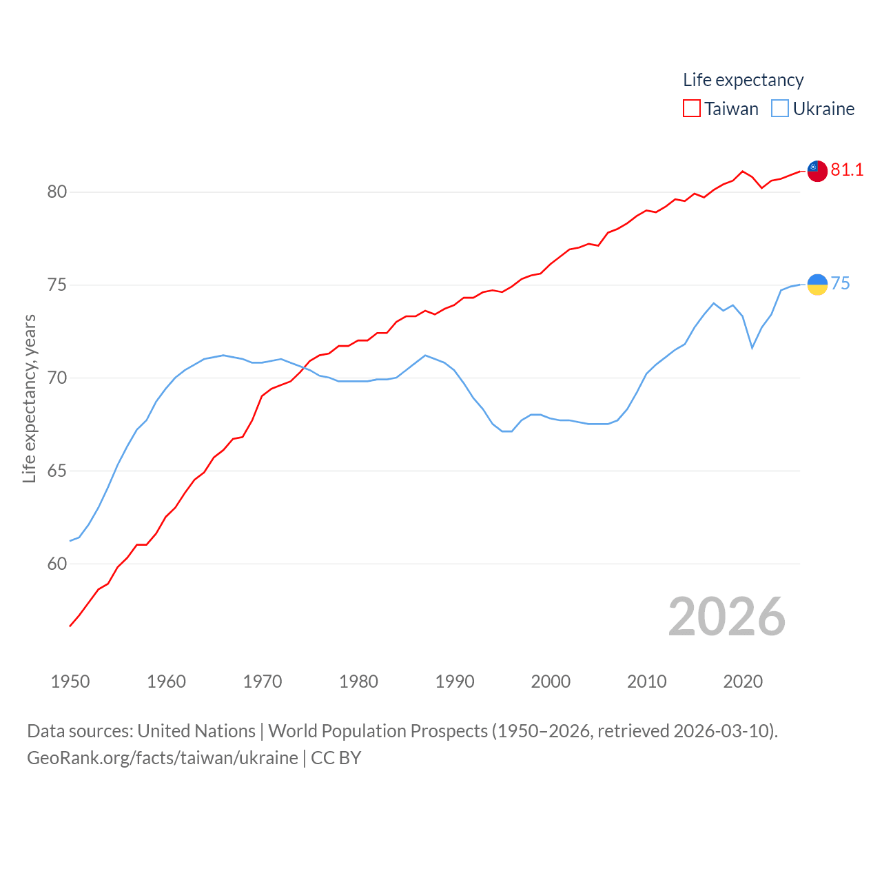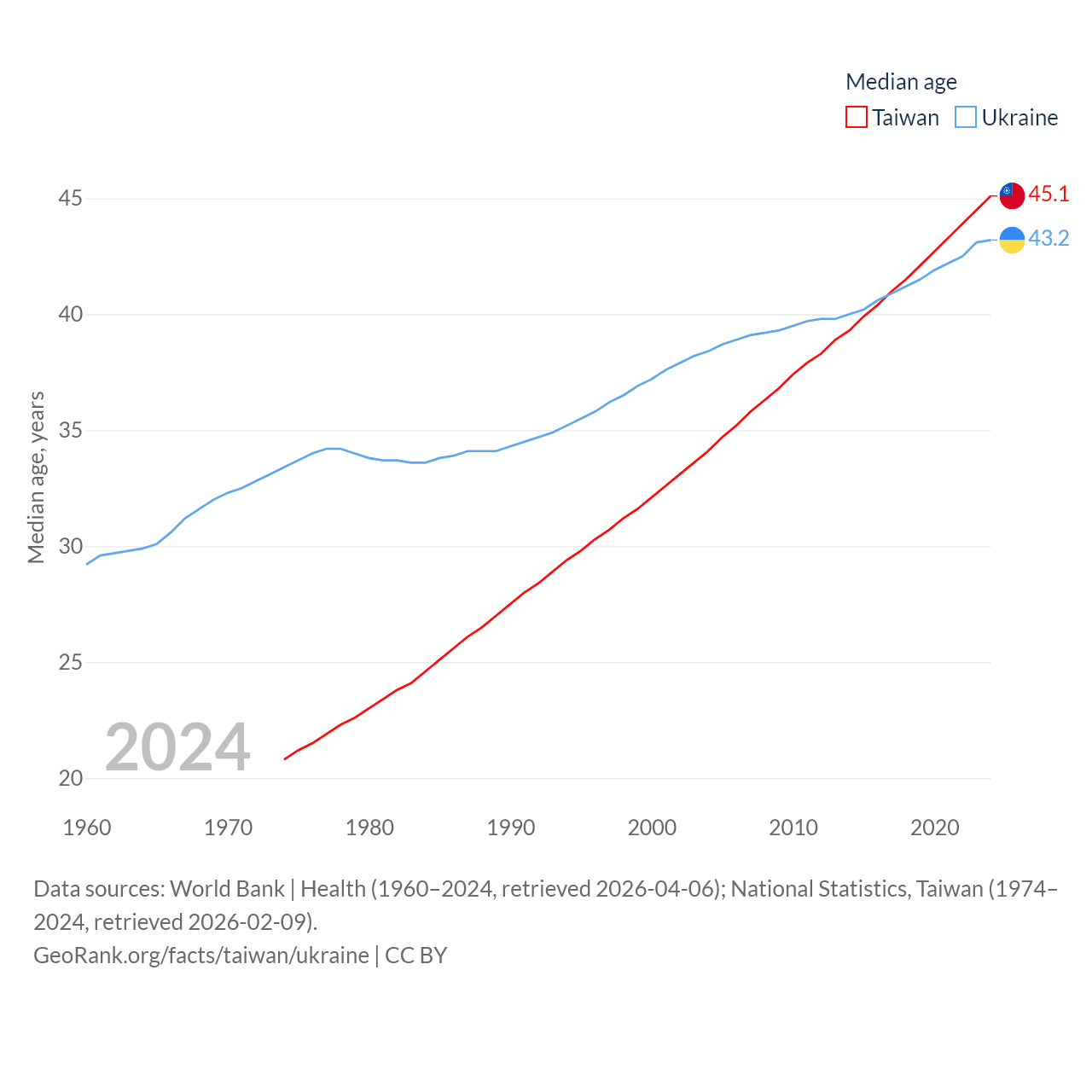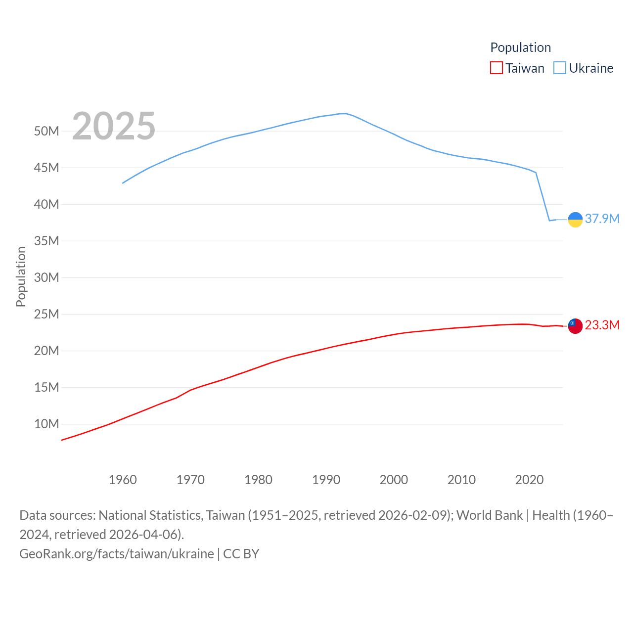 Taiwan has a population of 23.3M (ranked 60/197), compared with 37.9M in Ukraine (ranked 41/197). Taiwan's land area is 13,976 sq mi versus 223,708 sq mi for Ukraine (ranked 133rd vs. 46th).
