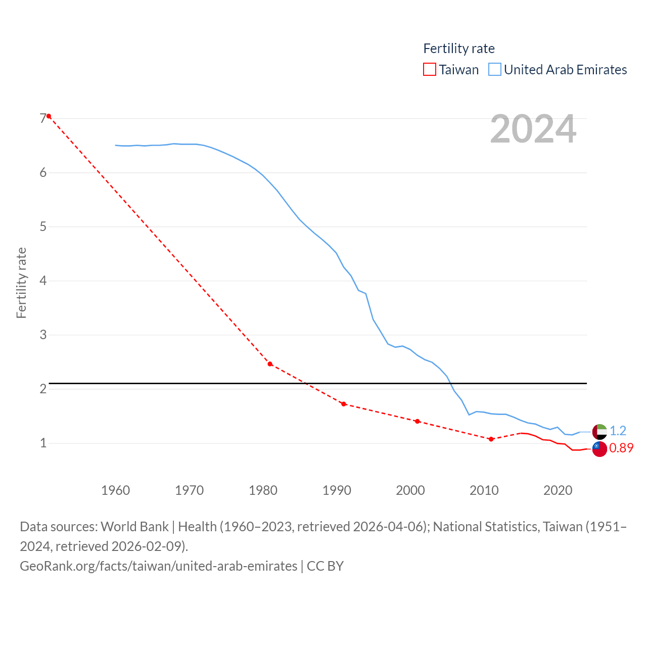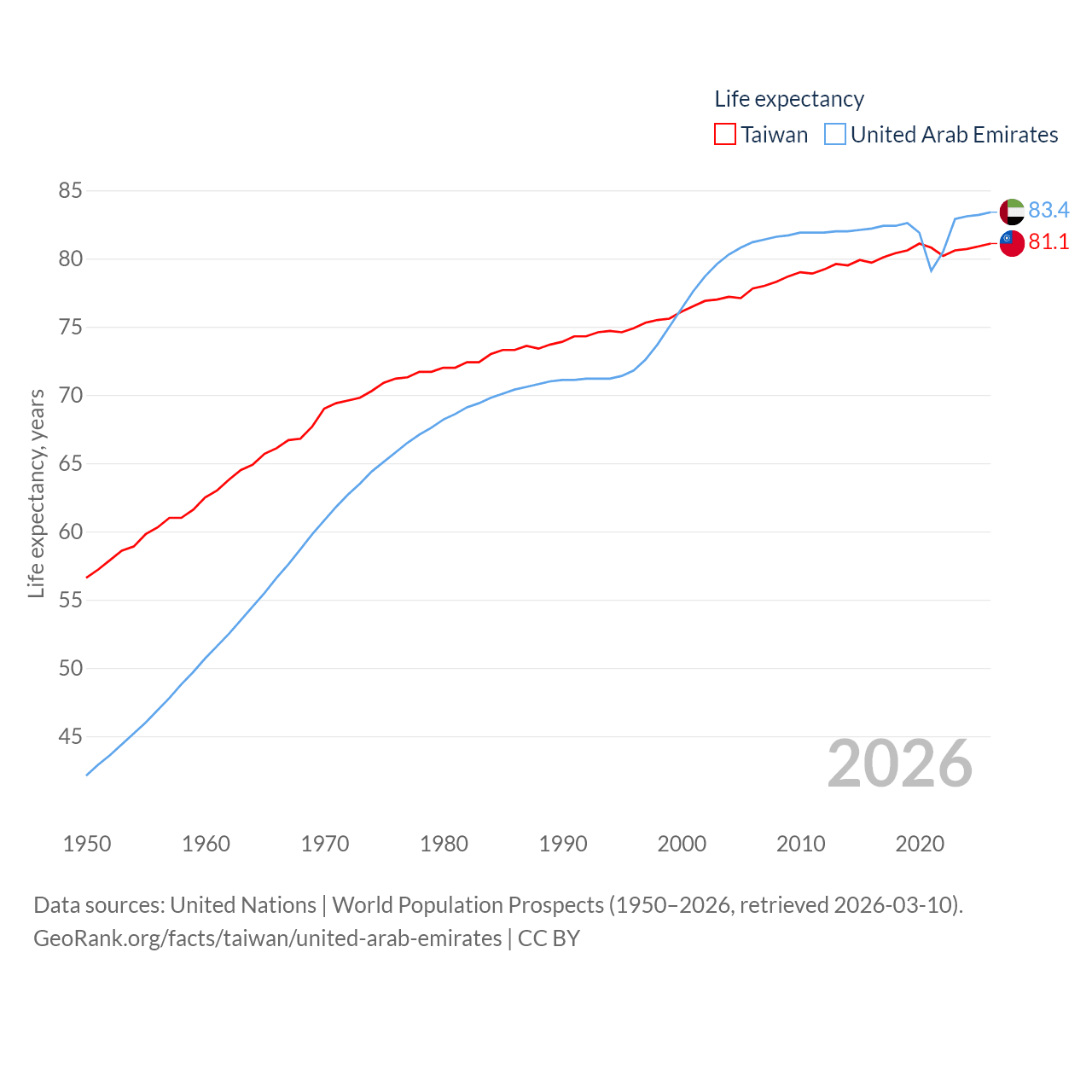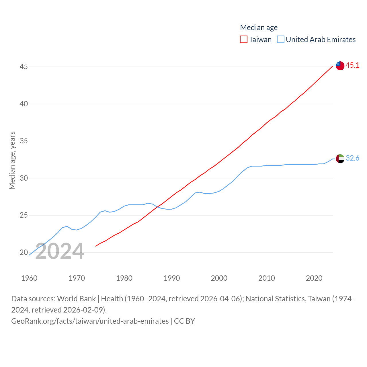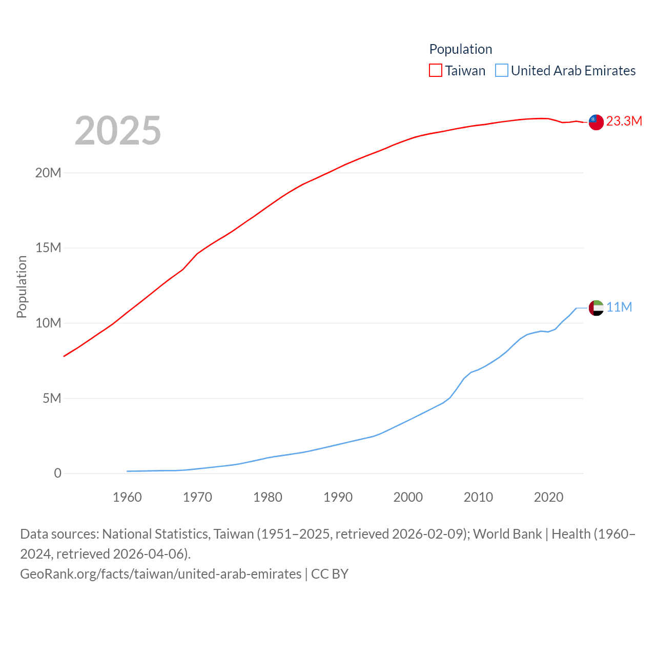 Taiwan has a population of 23.3M (ranked 60/197), compared with 11M in The United Arab Emirates (ranked 86/197). Taiwan's land area is 13,976 sq mi versus 27,421 sq mi for The United Arab Emirates (ranked 133rd vs. 117th).
