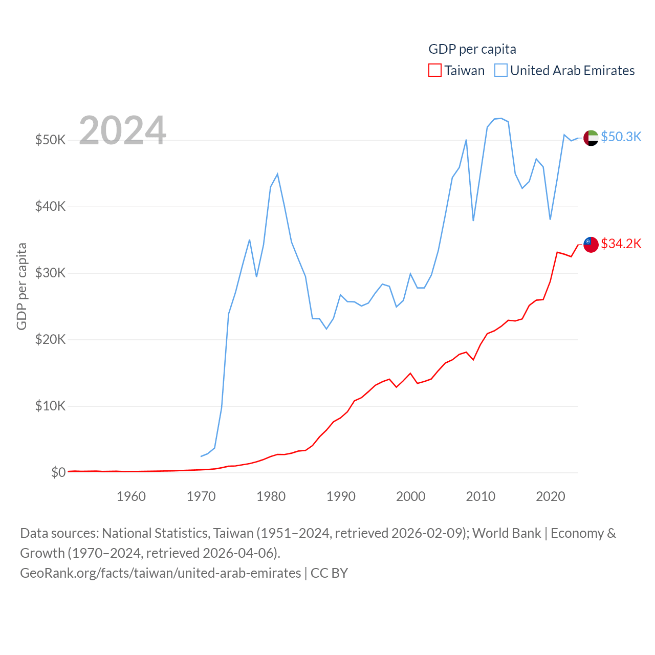 By GDP, Taiwan ranks 22/197 ($802B) and The United Arab Emirates ranks 27/197 ($552B). By GDP per capita, Taiwan ranks 35/197 ($34,238), while The United Arab Emirates ranks 24/197 ($50,274).