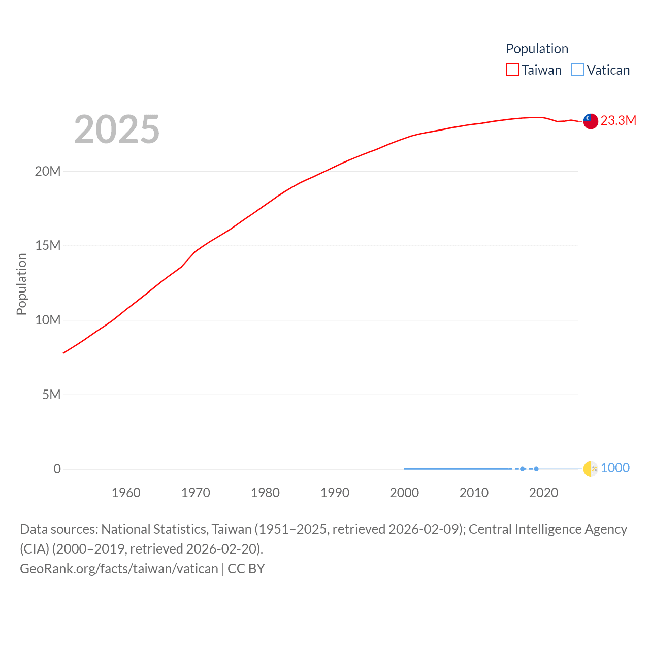 Data sources: National Statistics, Taiwan (1951–2025, retrieved 2026-02-09); Central Intelligence Agency (CIA) (2000–2019, retrieved 2026-02-20).