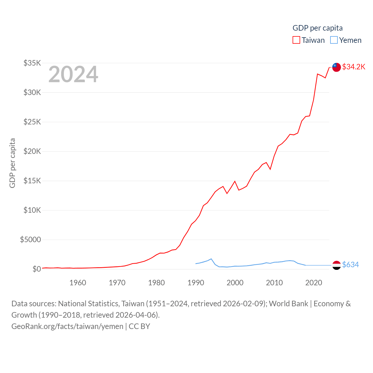 By GDP, Taiwan ranks 22/197 ($802B) and Yemen ranks 125/197 ($21.6B). By GDP per capita, Taiwan ranks 35/197 ($34,238), while Yemen ranks 191/197 ($634).