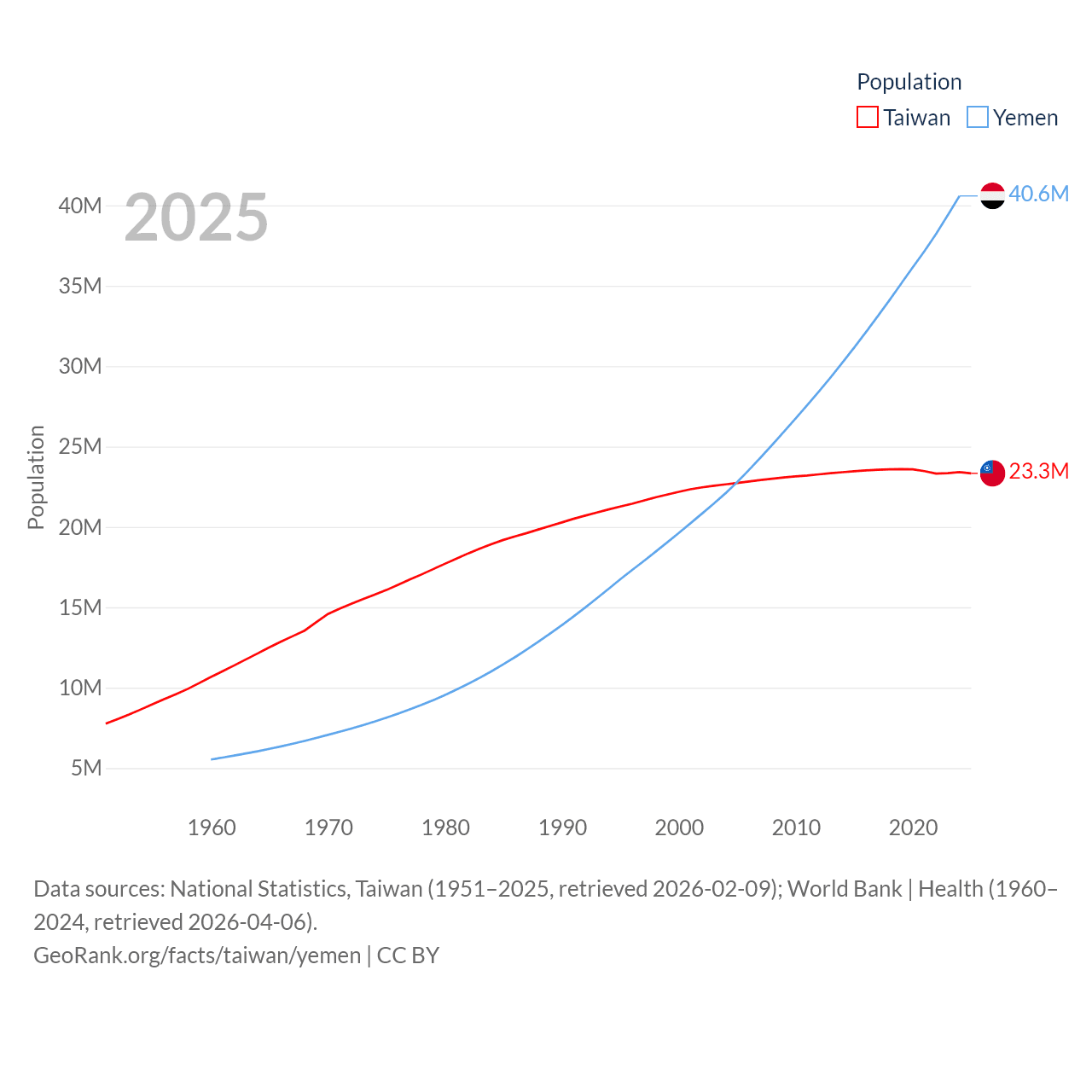 Taiwan has a population of 23.3M (ranked 60/197), compared with 40.6M in Yemen (ranked 38/197). Taiwan's land area is 13,976 sq mi versus 203,850 sq mi for Yemen (ranked 133rd vs. 49th).
