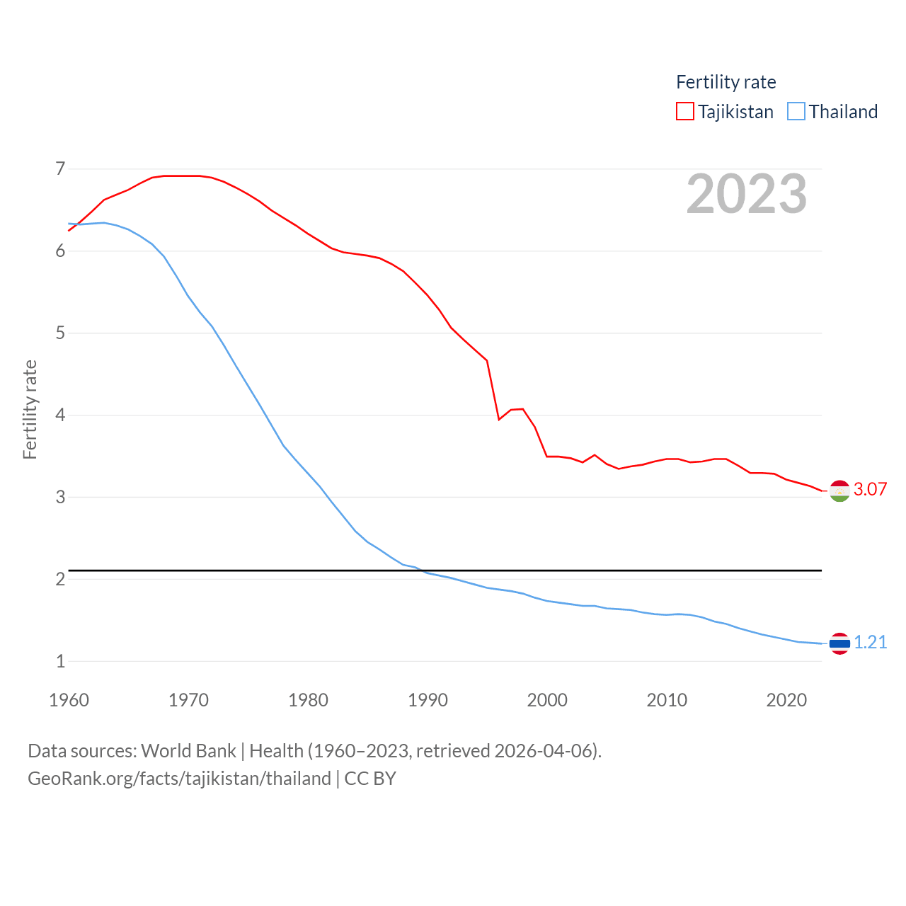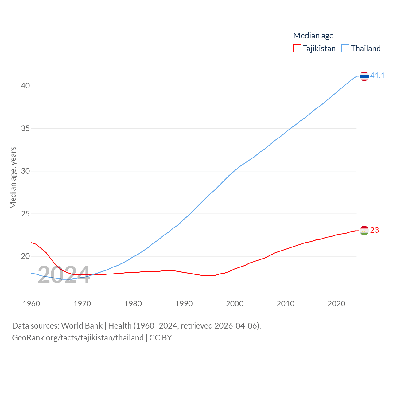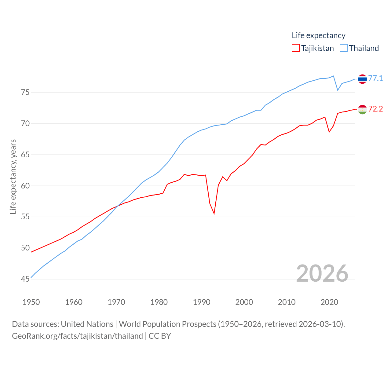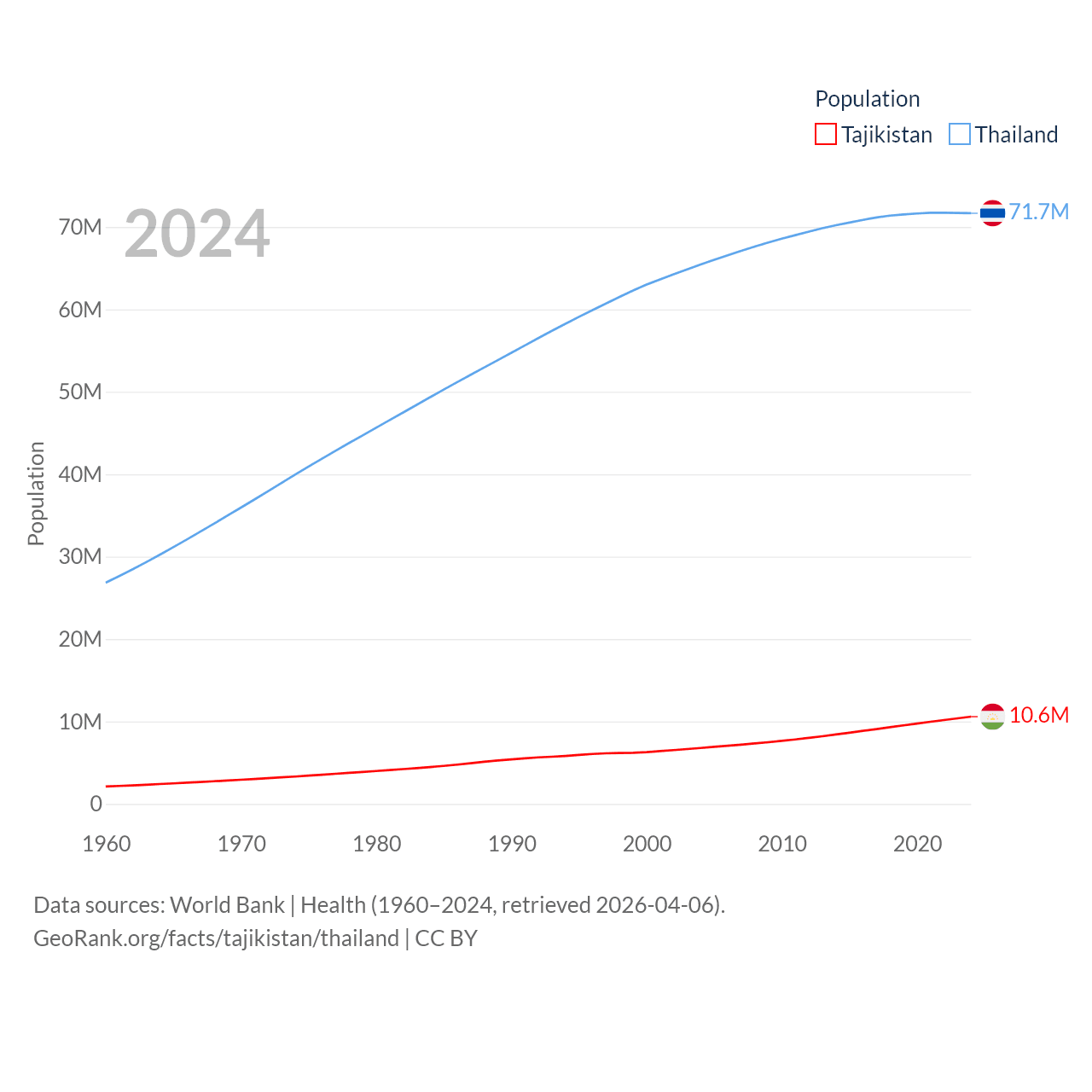 Tajikistan has a population of 10.6M (ranked 91/197), compared with 71.7M in Thailand (ranked 20/197). Tajikistan's land area is 53,587 sq mi versus 197,256 sq mi for Thailand (ranked 93rd vs. 50th).
