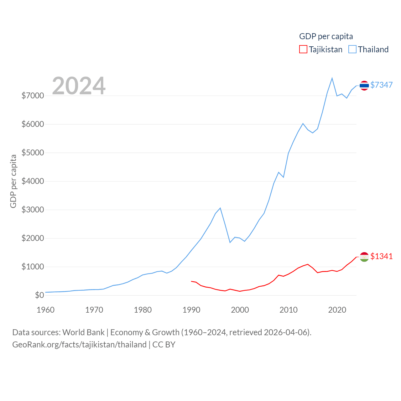 By GDP, Tajikistan ranks 145/197 ($14.2B) and Thailand ranks 31/197 ($527B). By GDP per capita, Tajikistan ranks 166/197 ($1,341), while Thailand ranks 100/197 ($7,347).