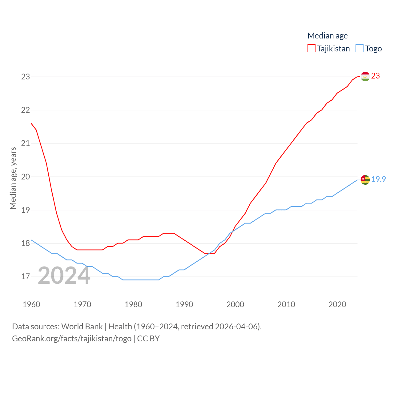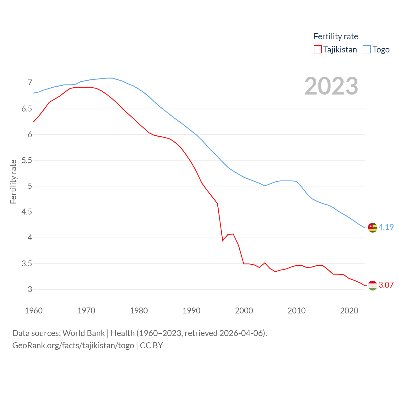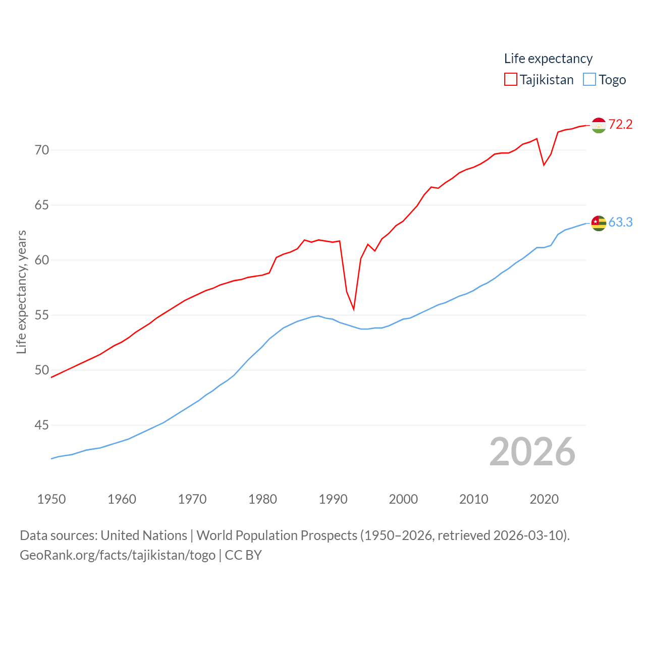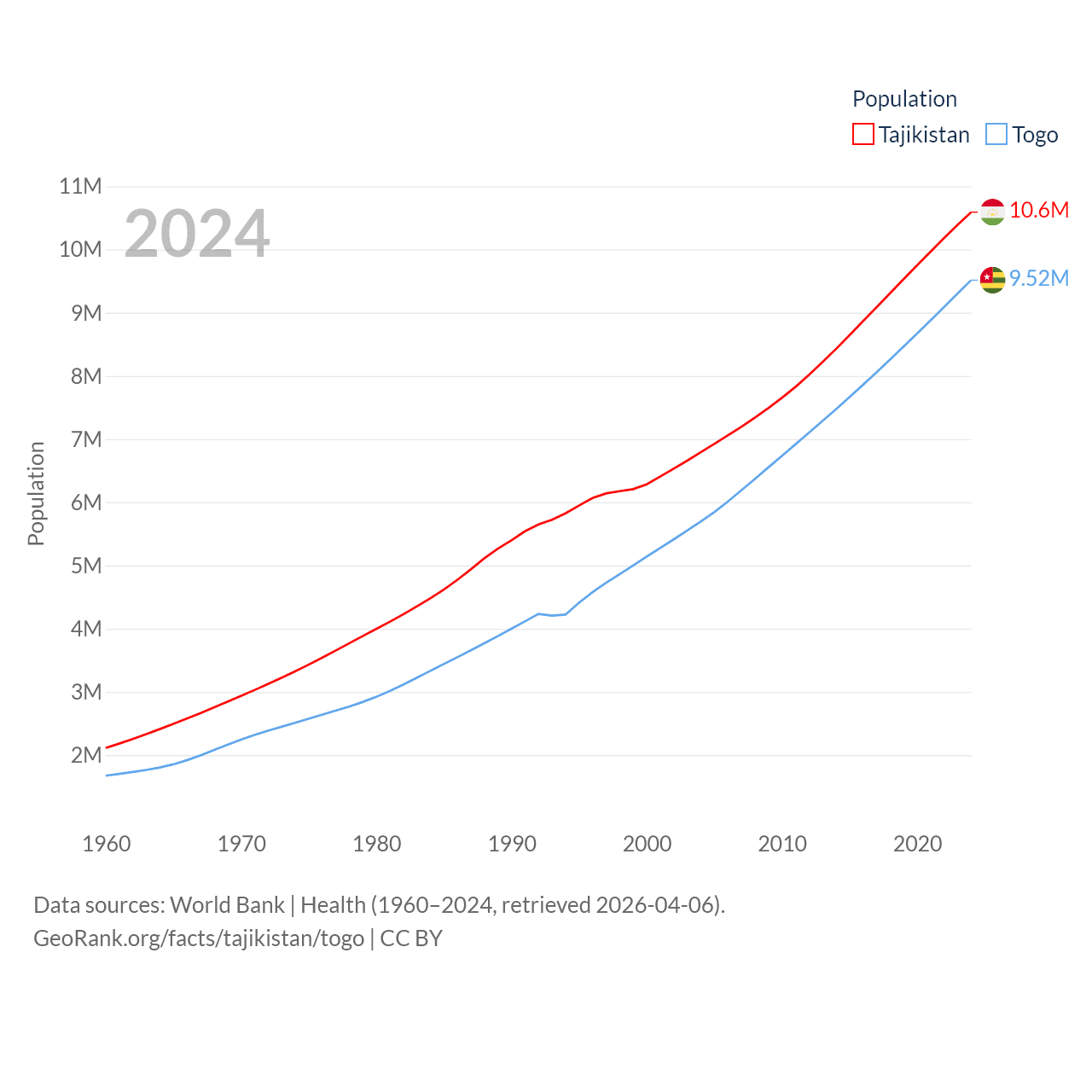 Tajikistan has a population of 10.6M (ranked 91/197), compared with 9.52M in Togo (ranked 98/197). Tajikistan's land area is 53,587 sq mi versus 21,000 sq mi for Togo (ranked 93rd vs. 124th).