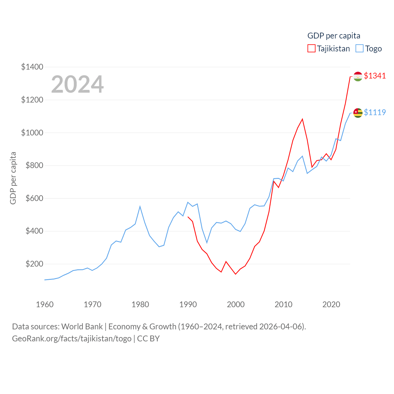 By GDP, Tajikistan ranks 145/197 ($14.2B) and Togo ranks 154/197 ($10.7B). By GDP per capita, Tajikistan ranks 166/197 ($1,341), while Togo ranks 172/197 ($1,119).