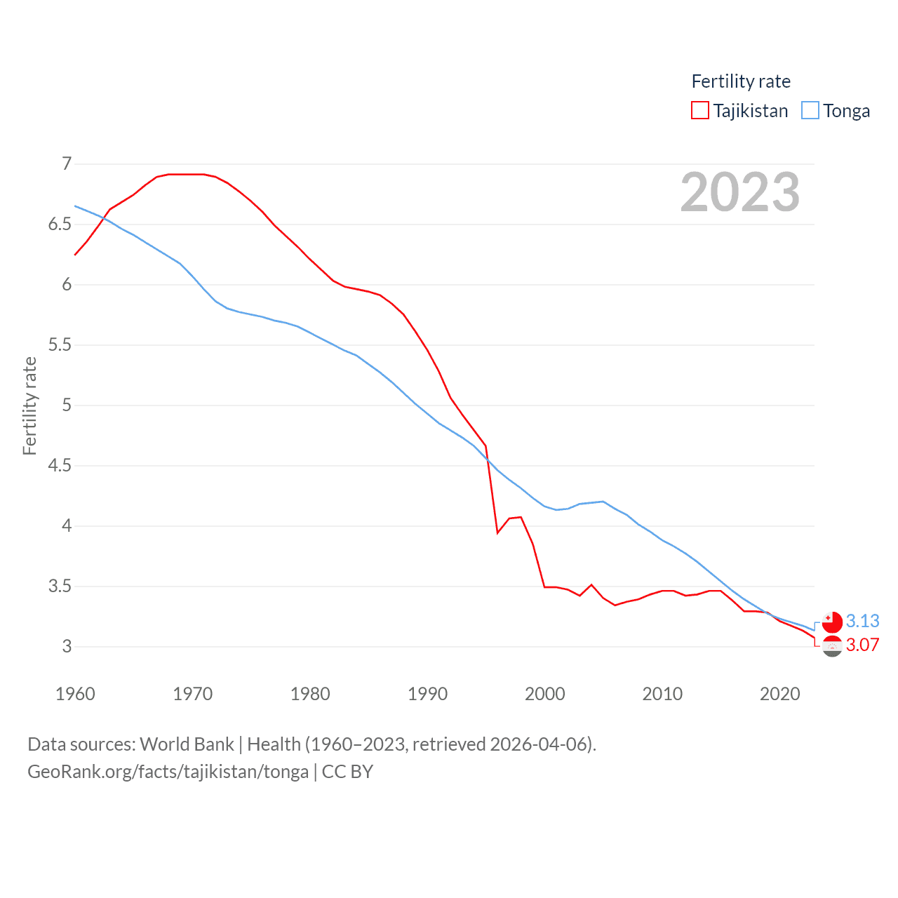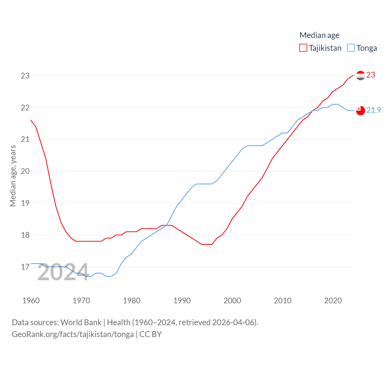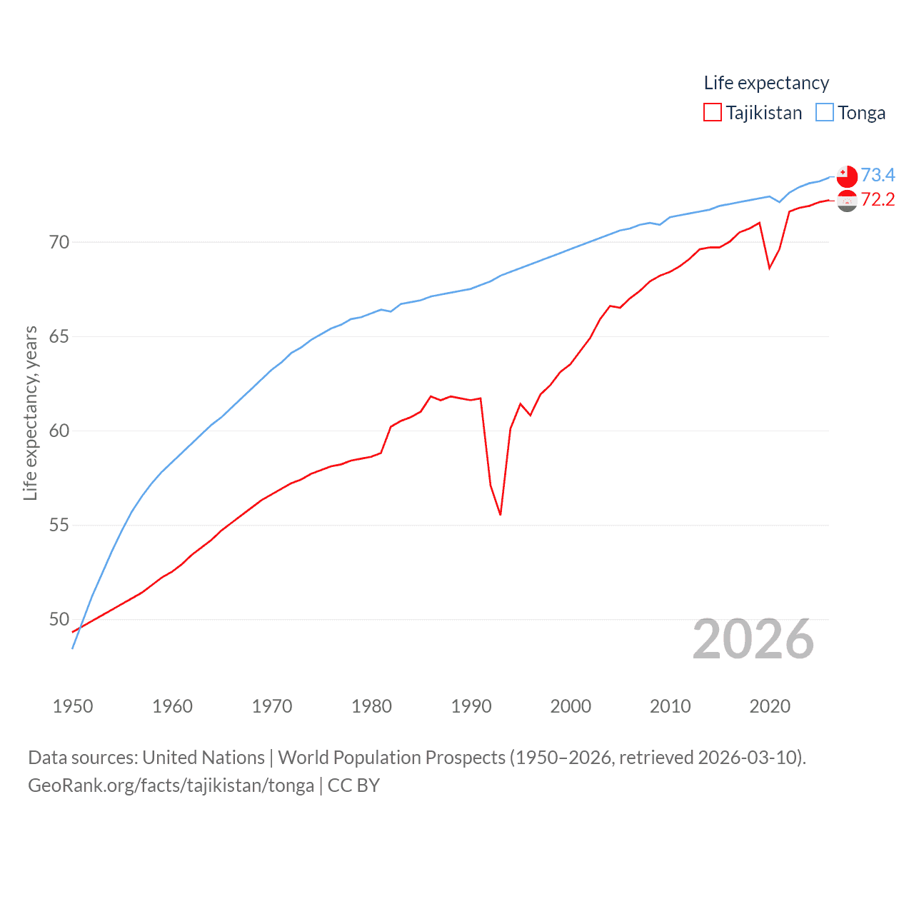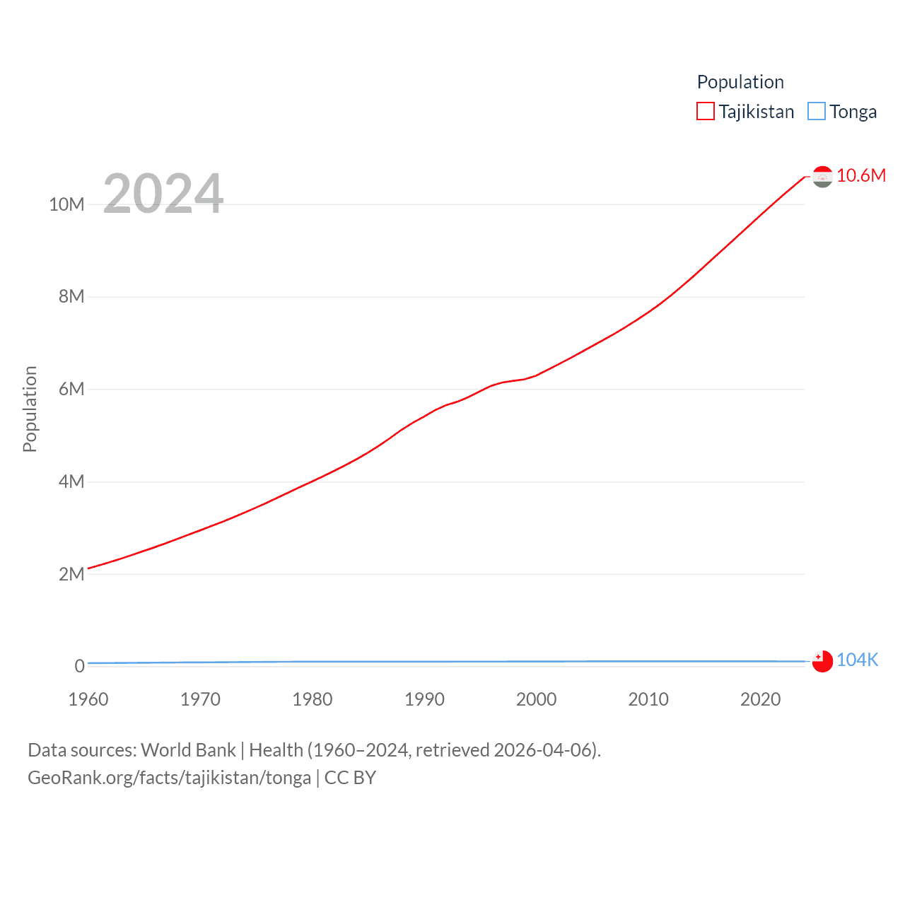 Tajikistan has a population of 10.6M (ranked 91/197), compared with 104K in Tonga (ranked 183/197). Tajikistan's land area is 53,587 sq mi versus 278 sq mi for Tonga (ranked 93rd vs. 176th).