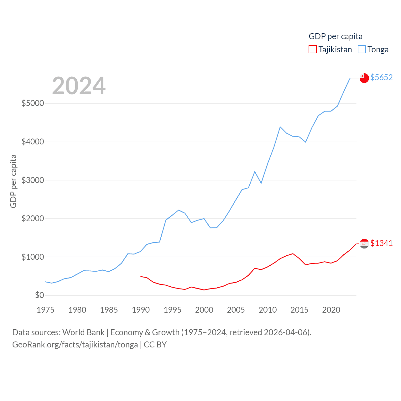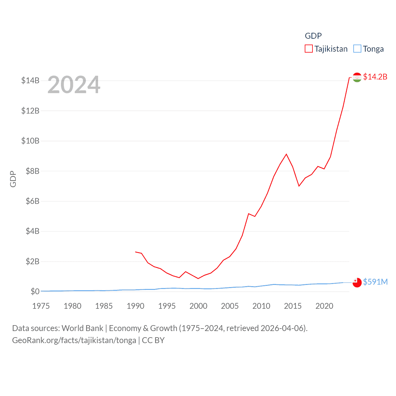 By GDP, Tajikistan ranks 145/197 ($14.2B) and Tonga ranks 191/197 ($591M). By GDP per capita, Tajikistan ranks 166/197 ($1,341), while Tonga ranks 115/197 ($5,652).