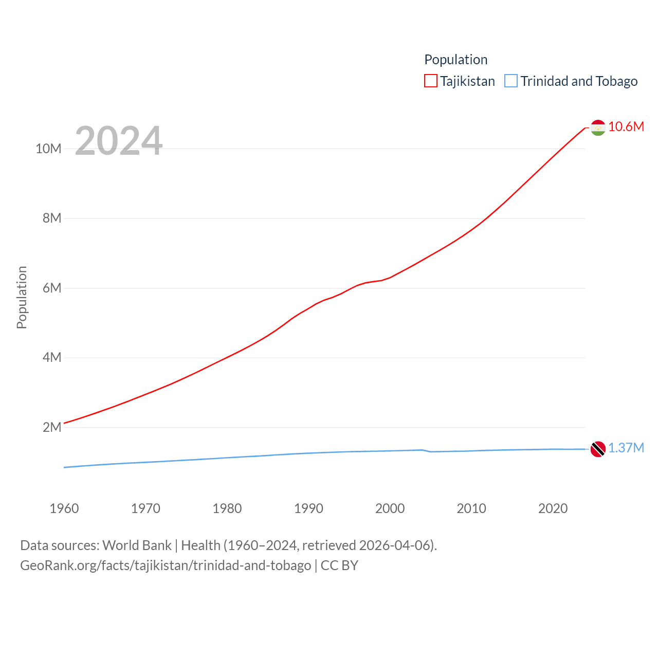 Tajikistan has a population of 10.6M (ranked 91/197), compared with 1.37M in Trinidad and Tobago (ranked 154/197). Tajikistan's land area is 53,587 sq mi versus 1,981 sq mi for Trinidad and Tobago (ranked 93rd vs. 166th).