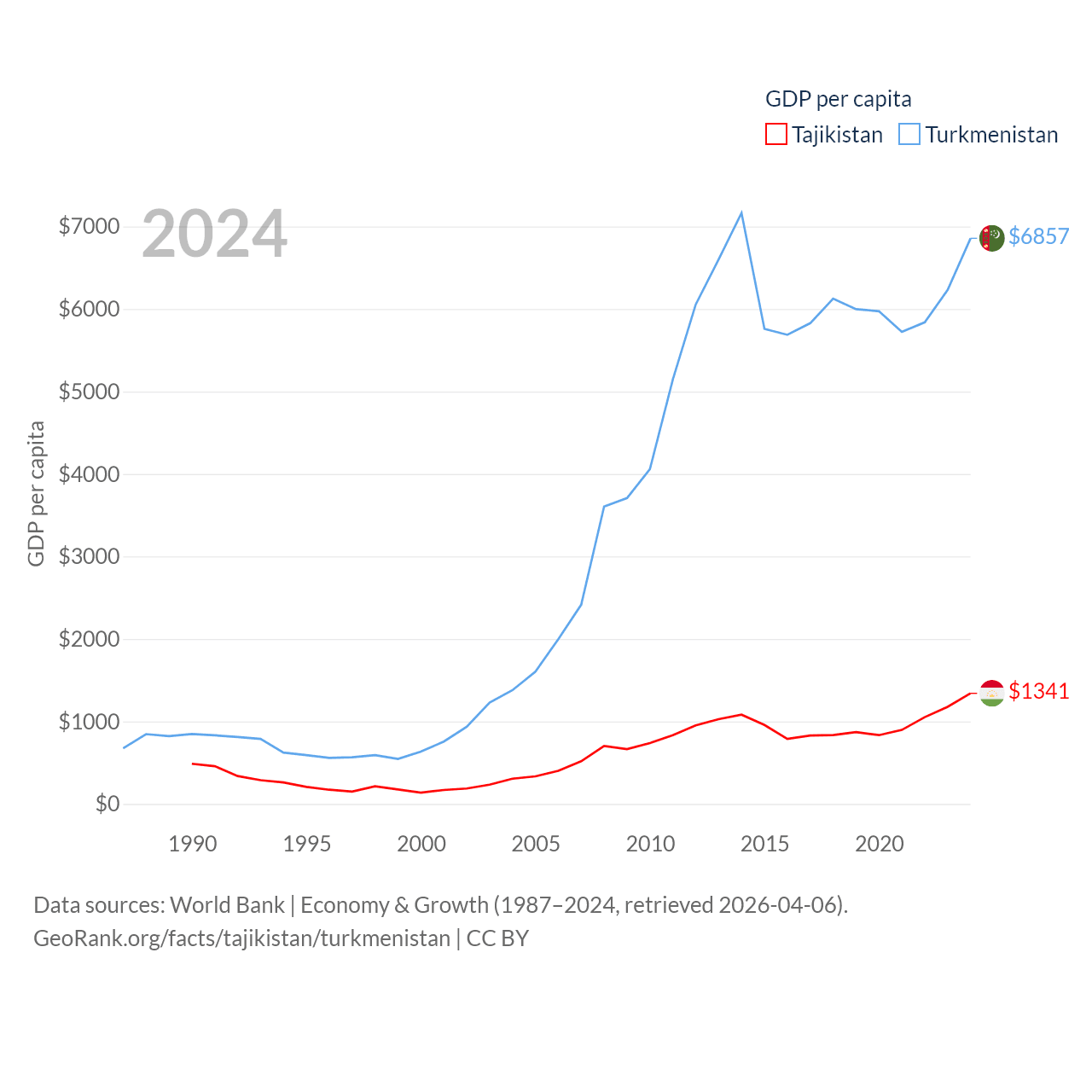By GDP, Tajikistan ranks 145/197 ($14.2B) and Turkmenistan ranks 92/197 ($51.4B). By GDP per capita, Tajikistan ranks 166/197 ($1,341), while Turkmenistan ranks 104/197 ($6,857).