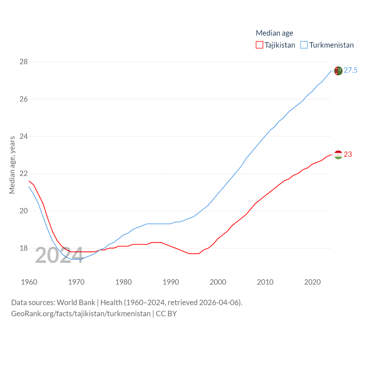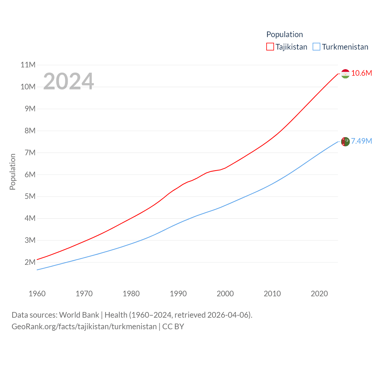 Tajikistan has a population of 10.6M (ranked 91/197), compared with 7.49M in Turkmenistan (ranked 104/197). Tajikistan's land area is 53,587 sq mi versus 181,441 sq mi for Turkmenistan (ranked 93rd vs. 53rd).