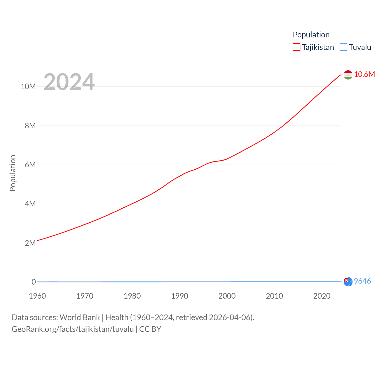 Tajikistan has a population of 10.6M (ranked 91/197), compared with 9.65K in Tuvalu (ranked 196/197). Tajikistan's land area is 53,587 sq mi versus 11.6 sq mi for Tuvalu (ranked 93rd vs. 194th).