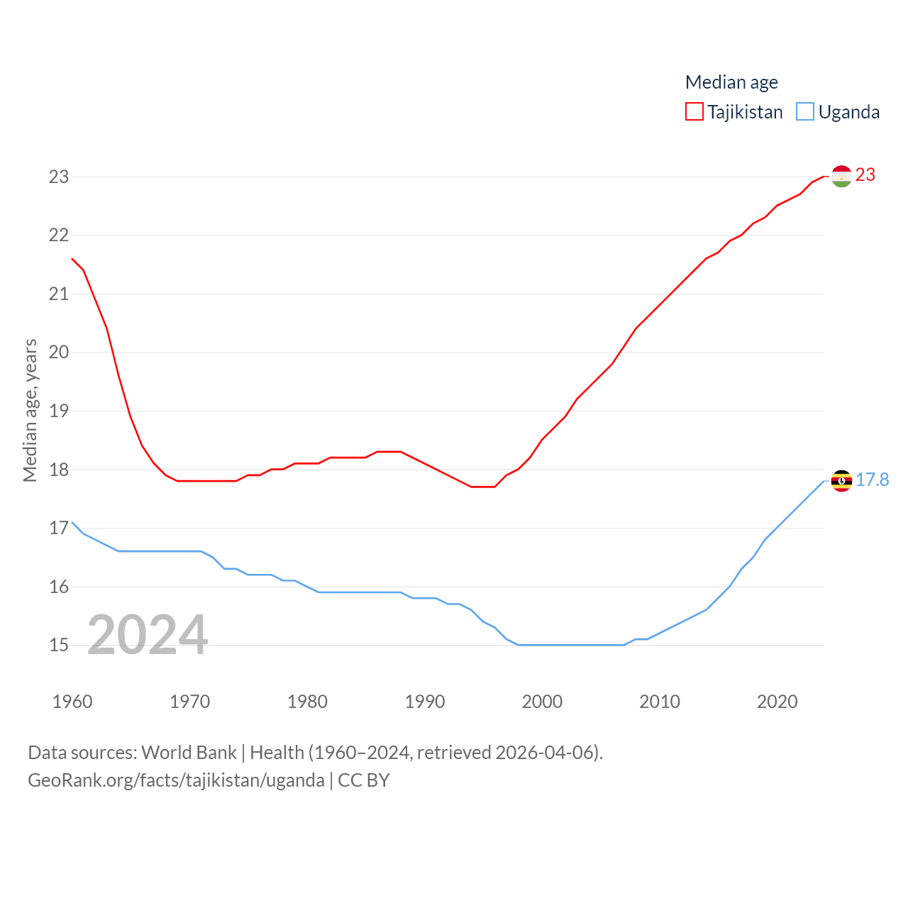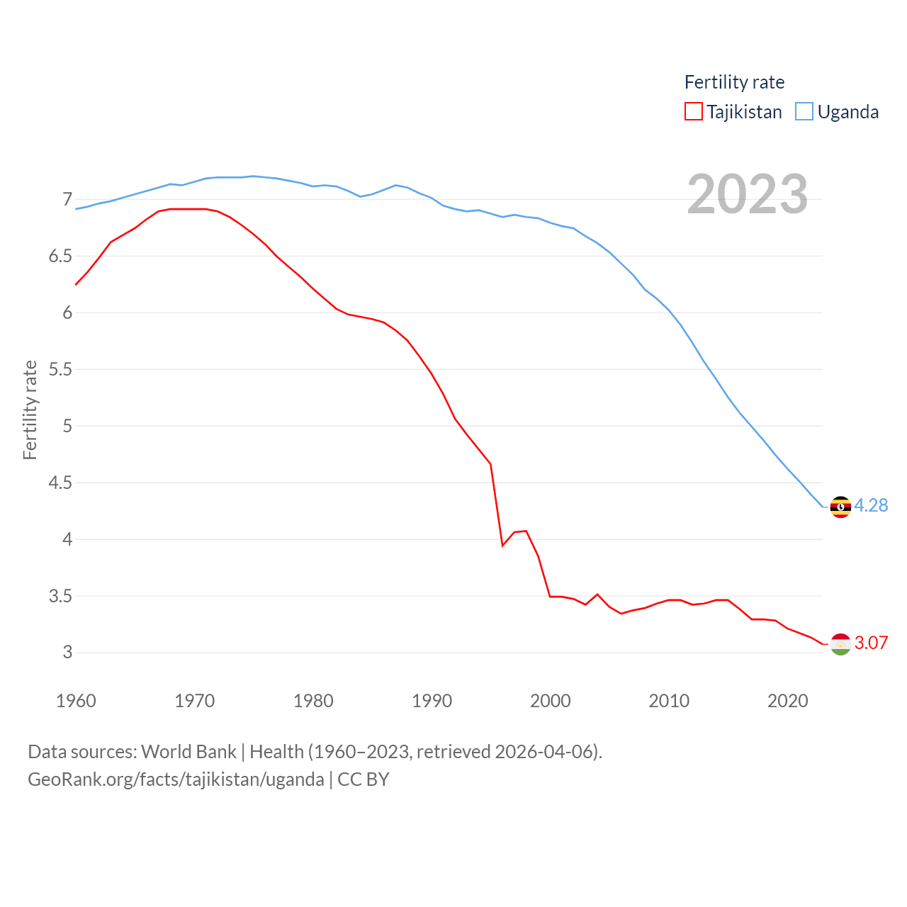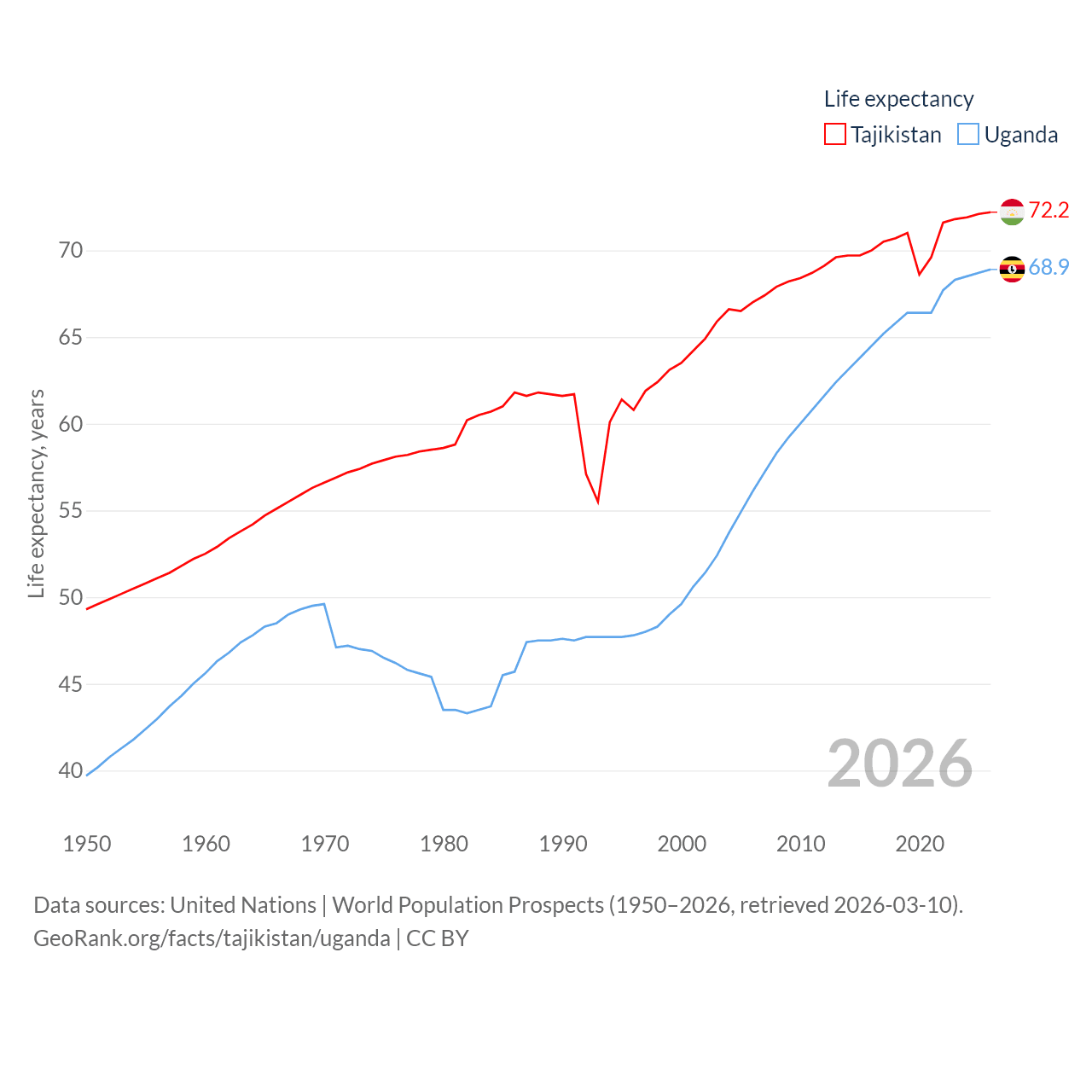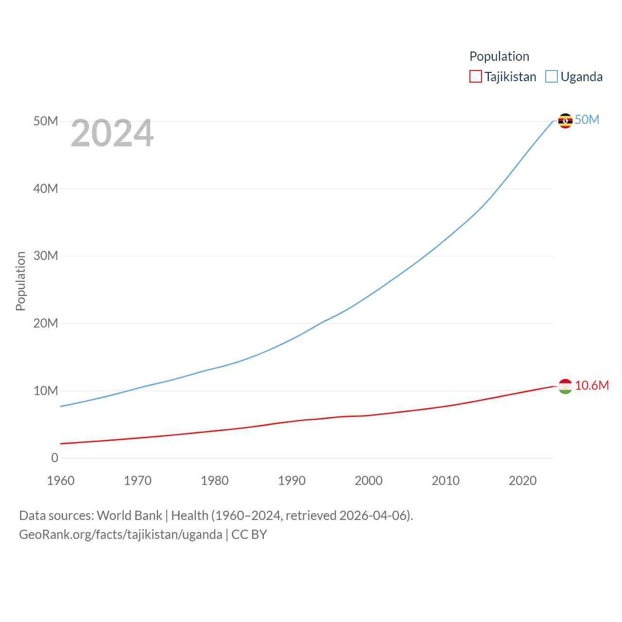 Tajikistan has a population of 10.6M (ranked 91/197), compared with 50M in Uganda (ranked 31/197). Tajikistan's land area is 53,587 sq mi versus 77,421 sq mi for Uganda (ranked 93rd vs. 84th).