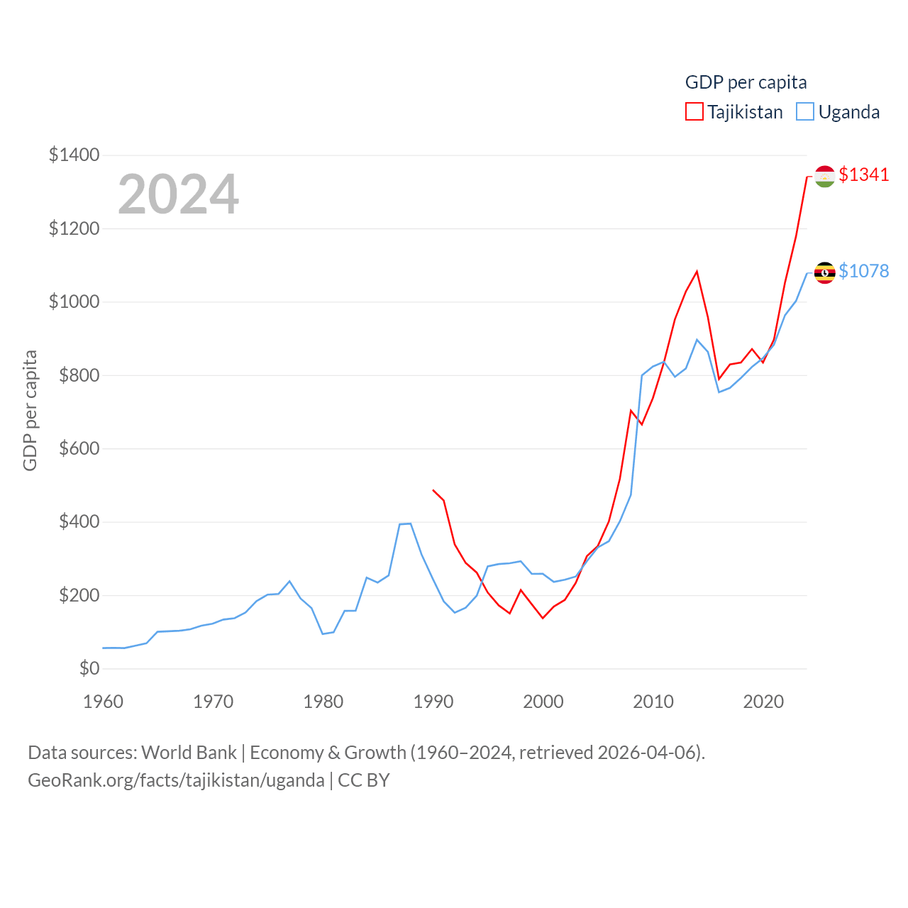 By GDP, Tajikistan ranks 145/197 ($14.2B) and Uganda ranks 89/197 ($53.9B). By GDP per capita, Tajikistan ranks 166/197 ($1,341), while Uganda ranks 176/197 ($1,078).