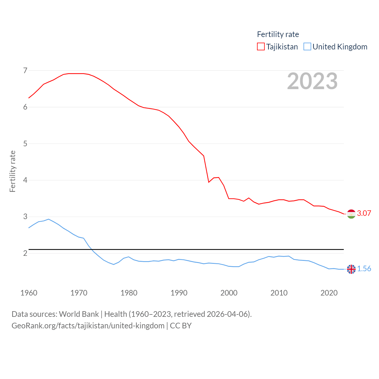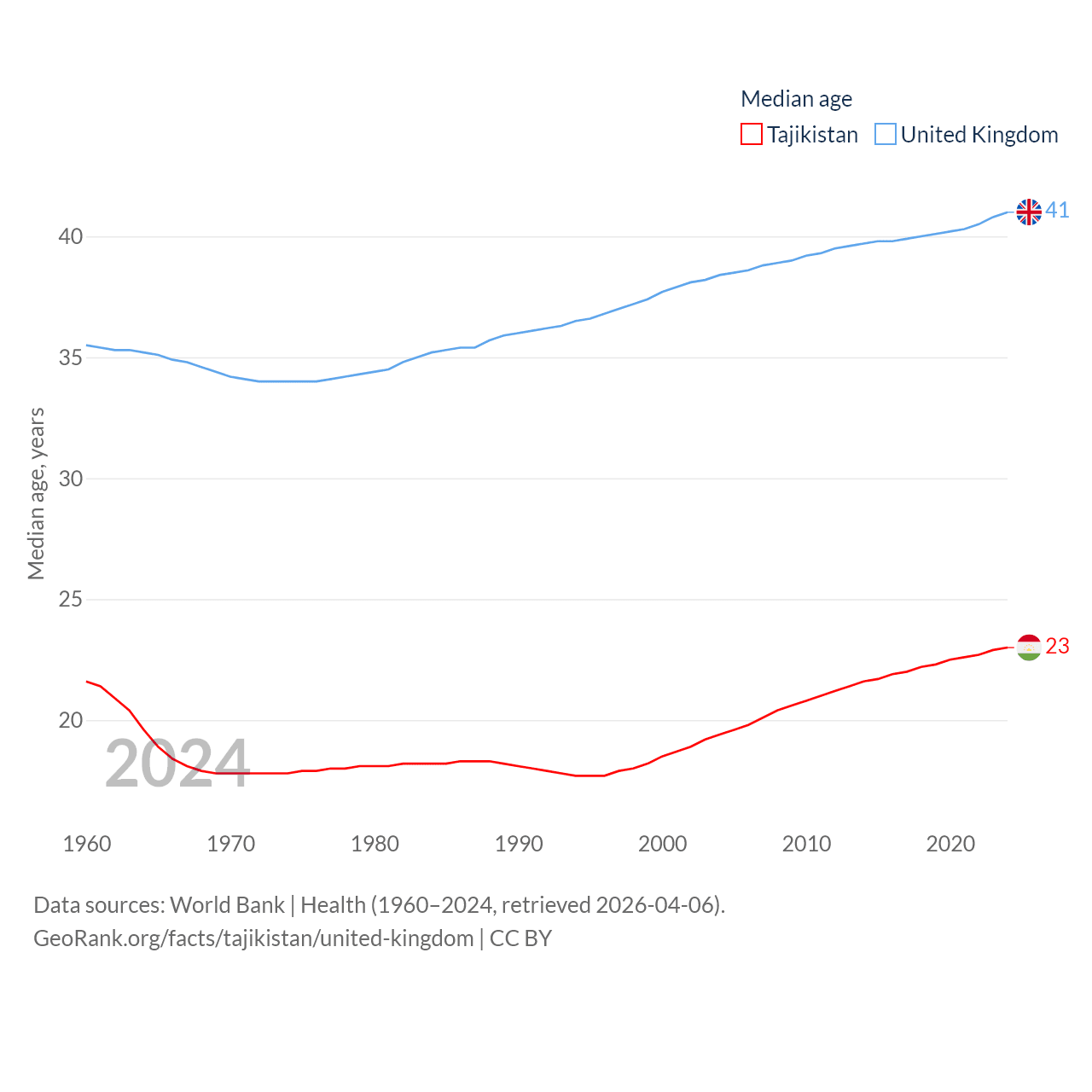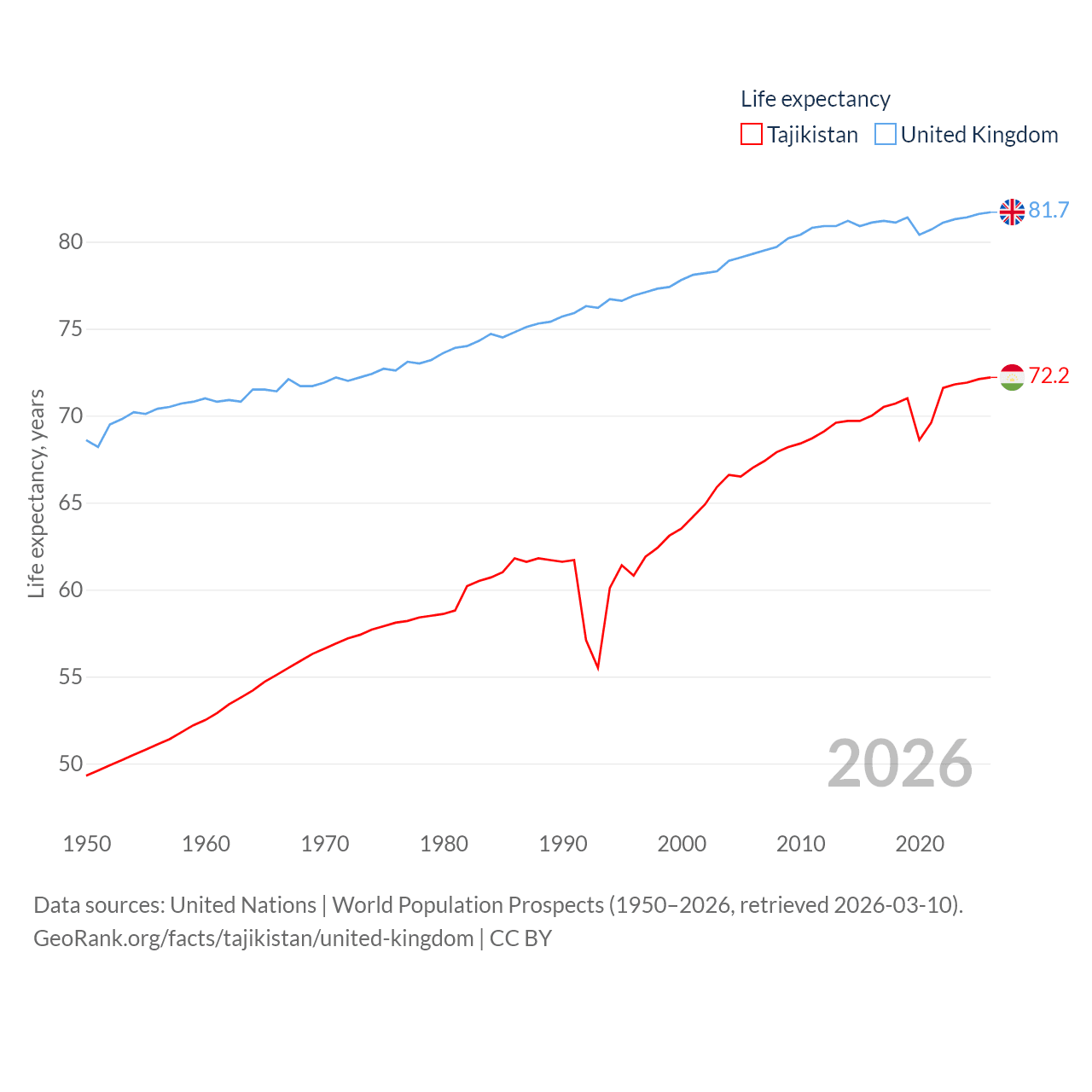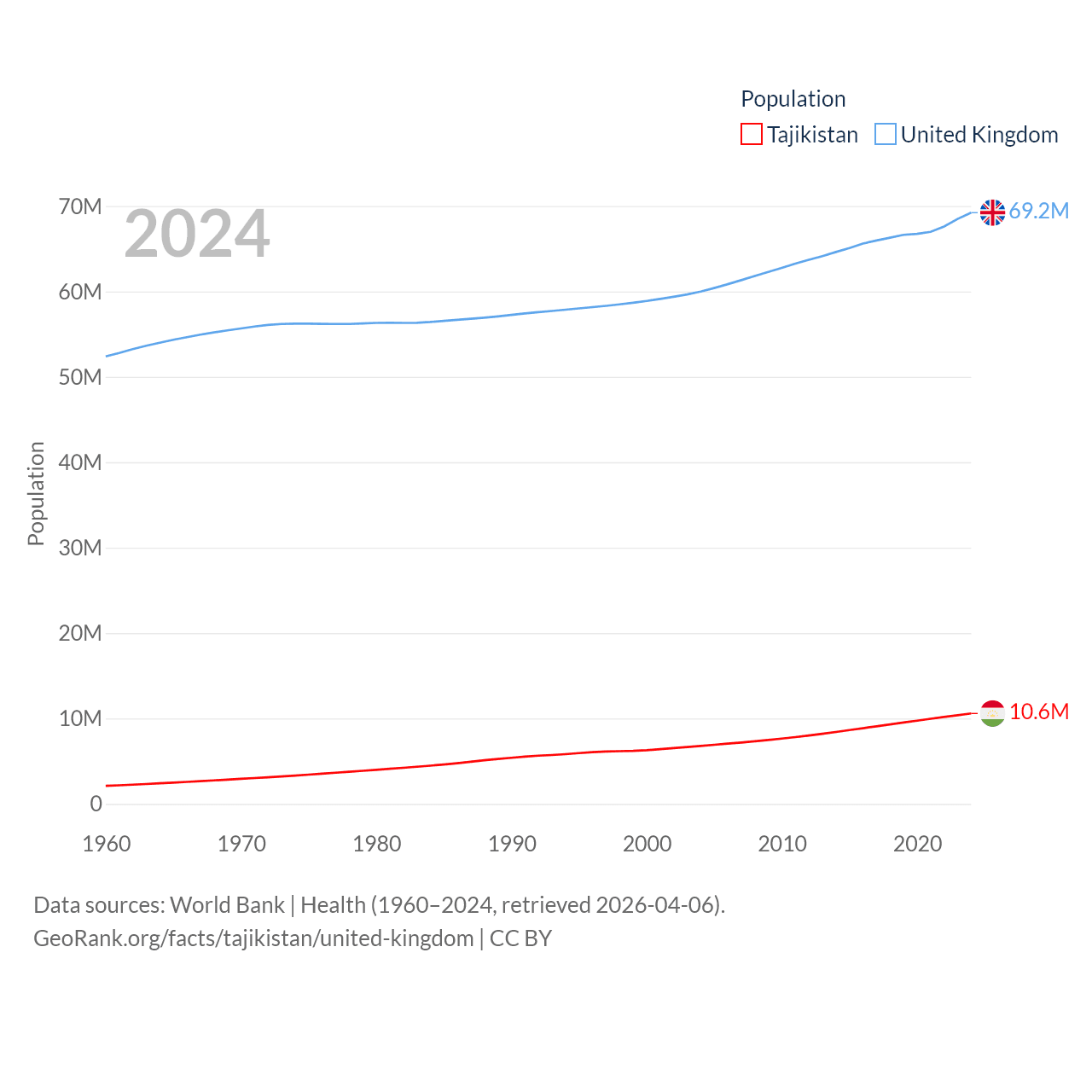 Tajikistan has a population of 10.6M (ranked 91/197), compared with 69.2M in The United Kingdom (ranked 21/197). Tajikistan's land area is 53,587 sq mi versus 93,410 sq mi for The United Kingdom (ranked 93rd vs. 78th).