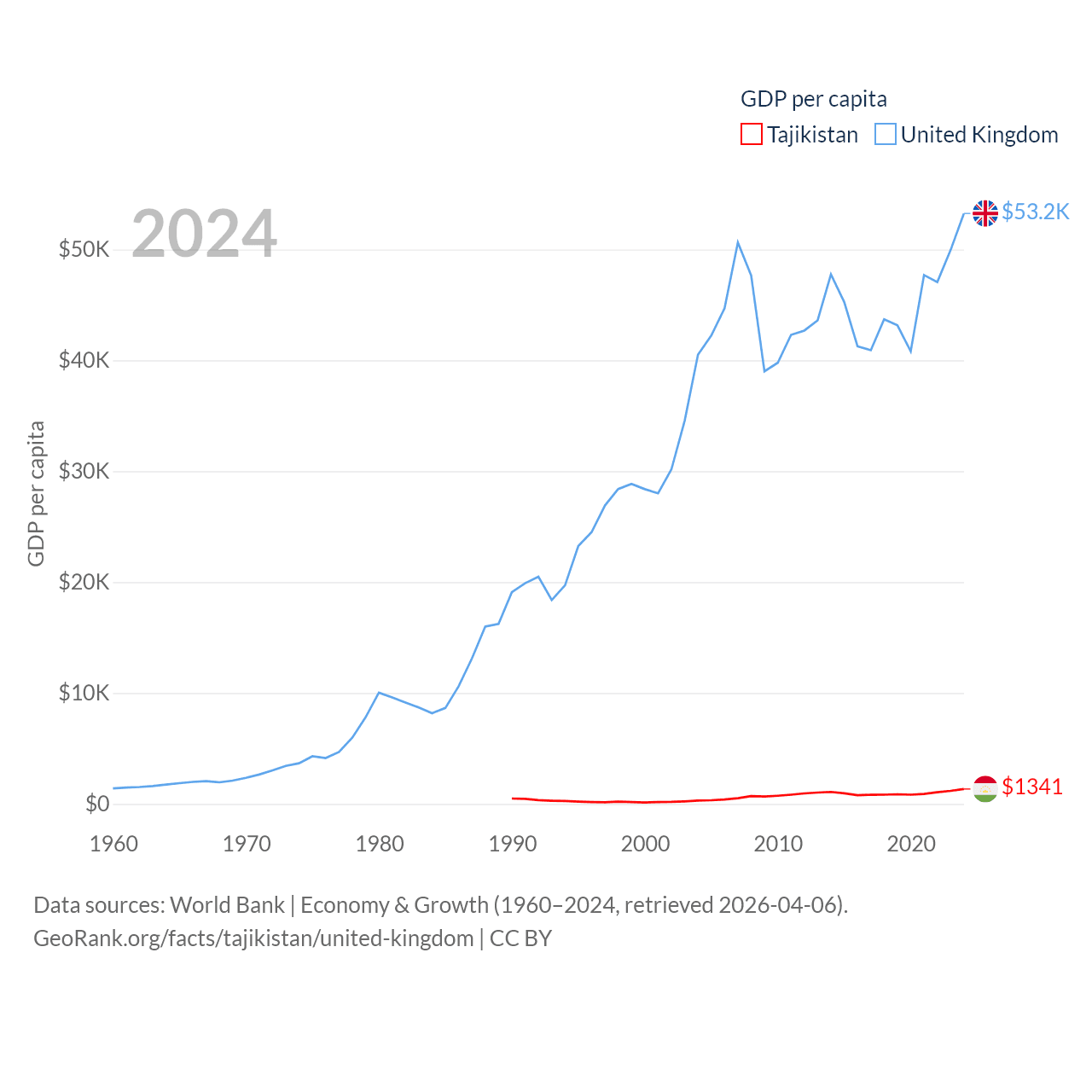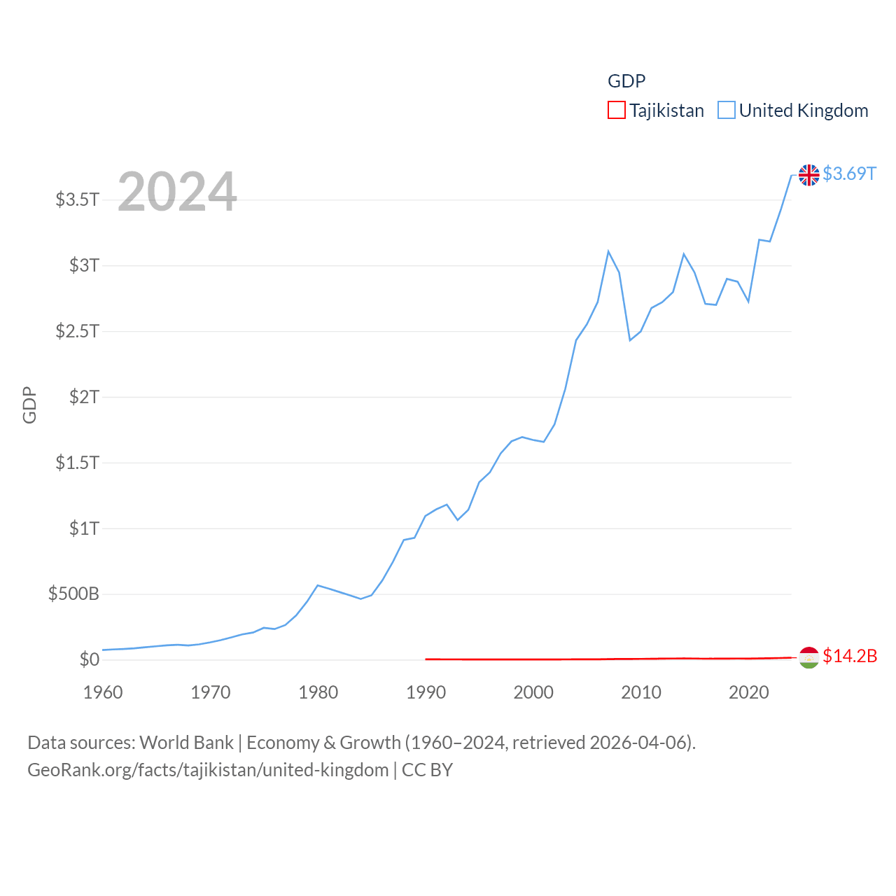 By GDP, Tajikistan ranks 145/197 ($14.2B) and The United Kingdom ranks 6/197 ($3.69T). By GDP per capita, Tajikistan ranks 166/197 ($1,341), while The United Kingdom ranks 22/197 ($53,246).