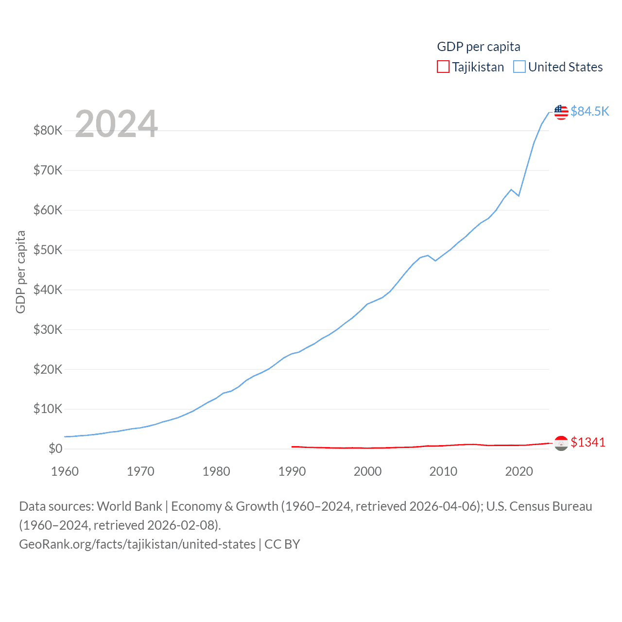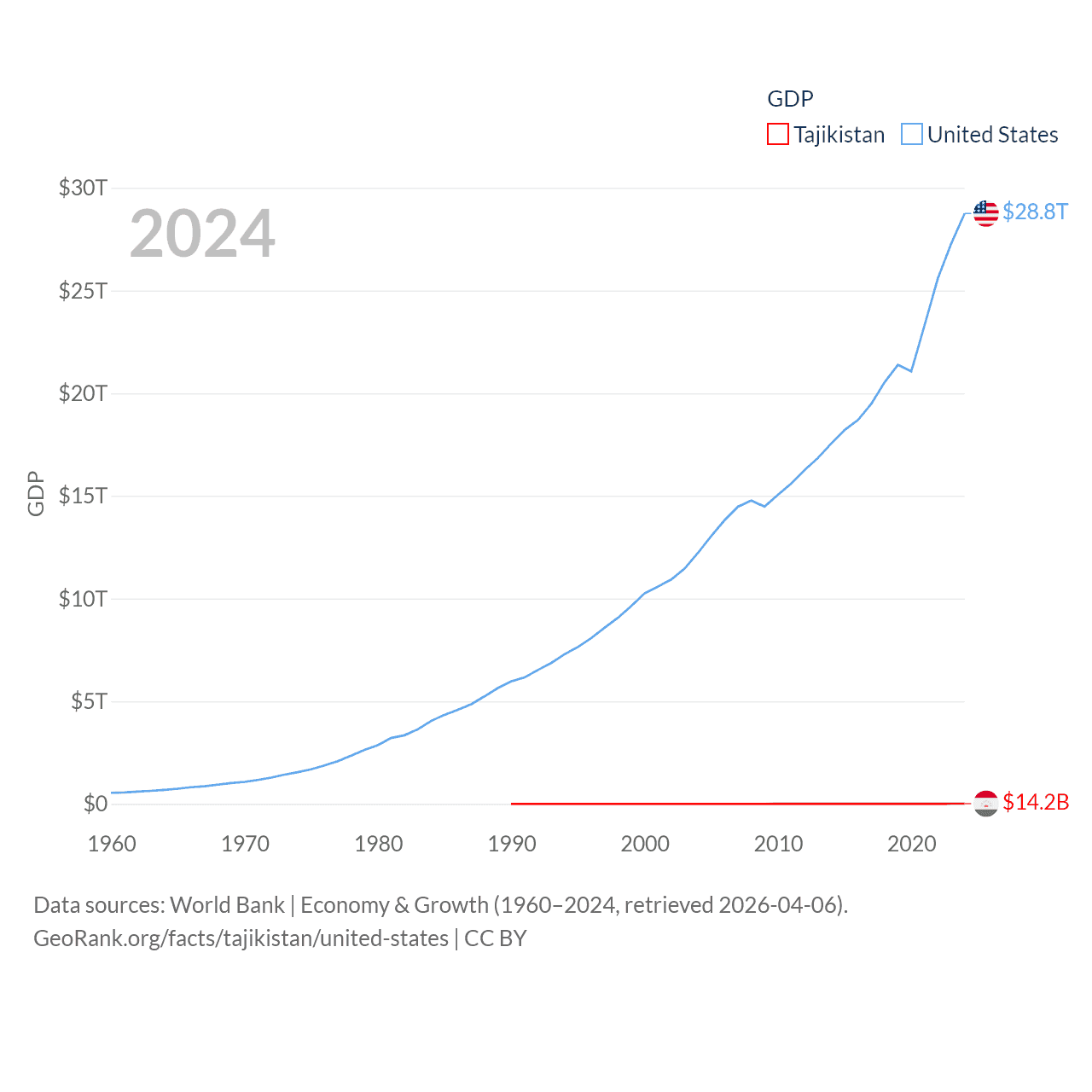 By GDP, Tajikistan ranks 145/197 ($14.2B) and The United States ranks 1/197 ($28.8T). By GDP per capita, Tajikistan ranks 166/197 ($1,341), while The United States ranks 10/197 ($84,534).
