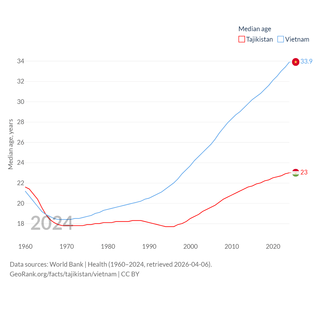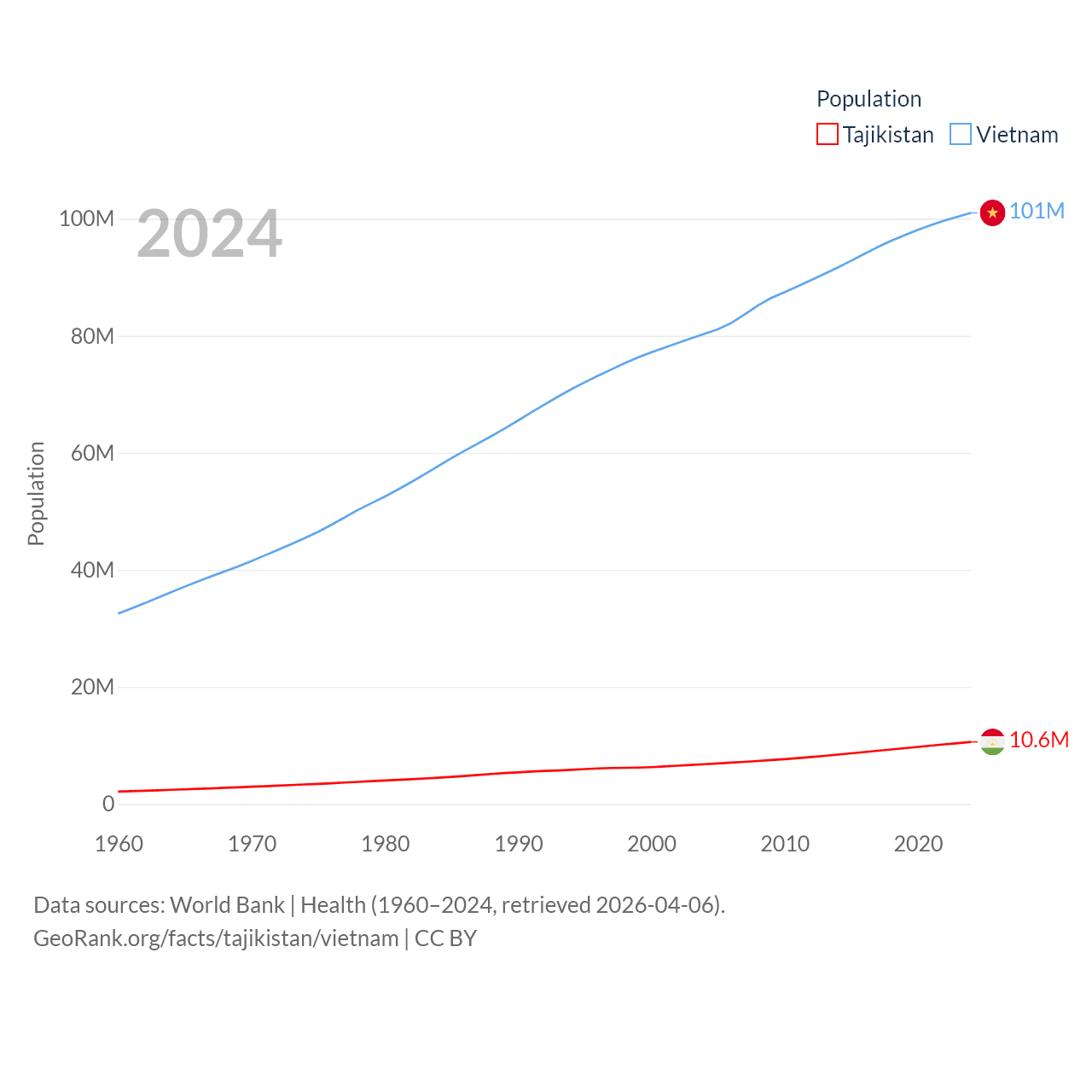 Tajikistan has a population of 10.6M (ranked 91/197), compared with 101M in Vietnam (ranked 16/197). Tajikistan's land area is 53,587 sq mi versus 121,016 sq mi for Vietnam (ranked 93rd vs. 67th).