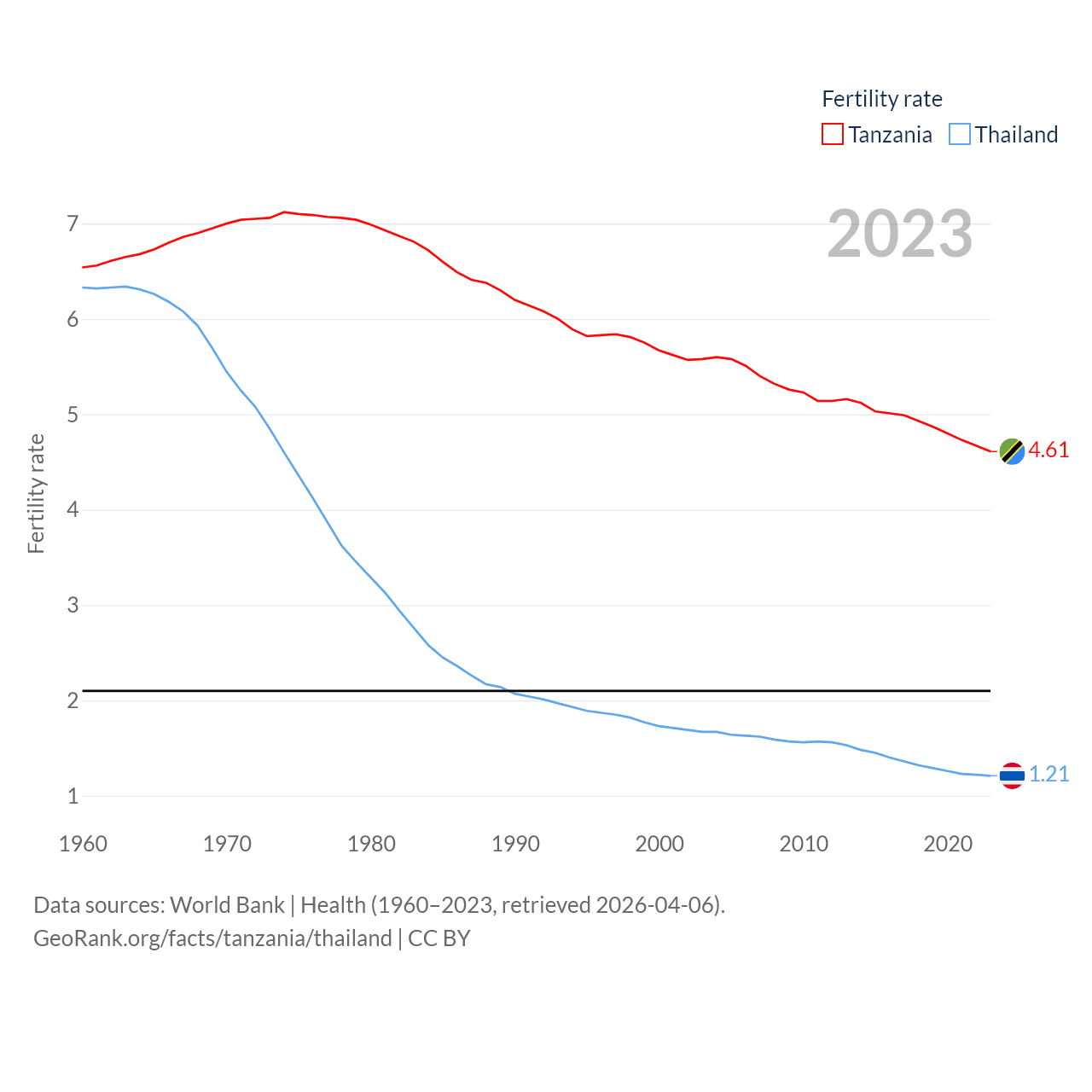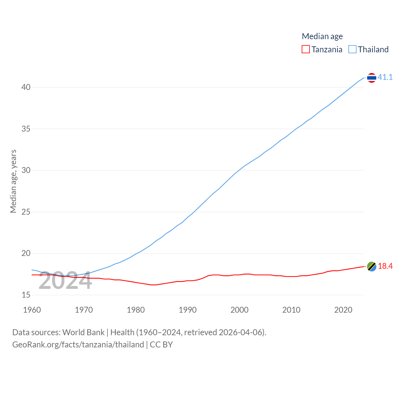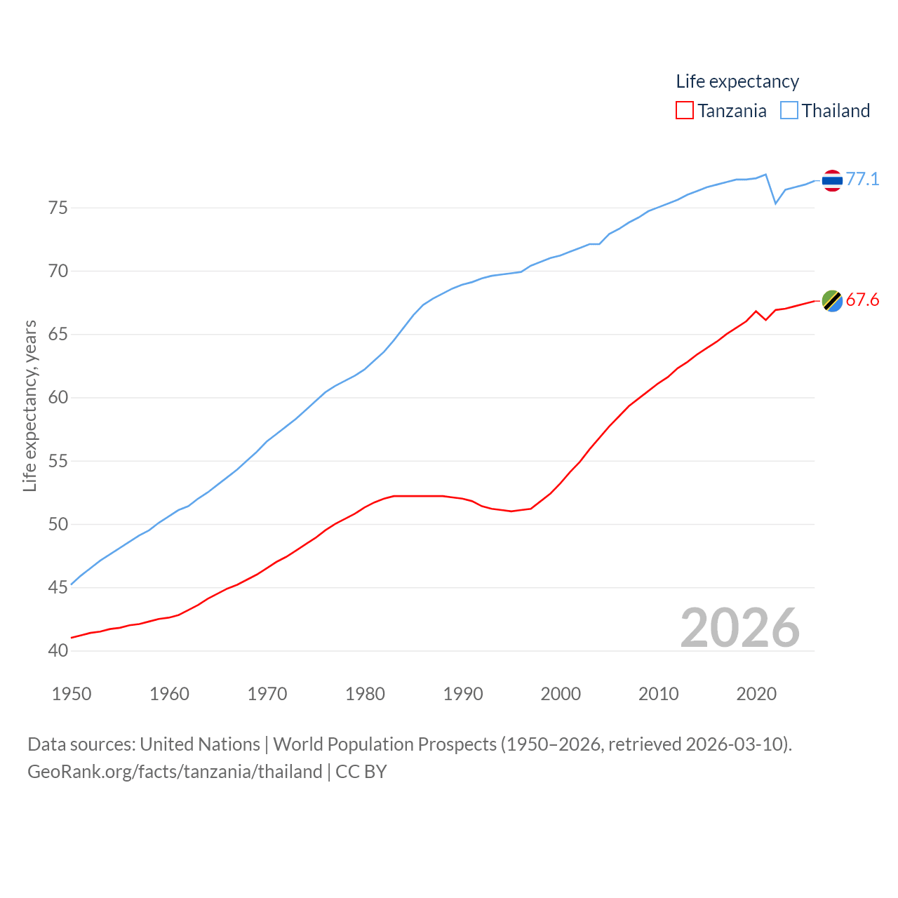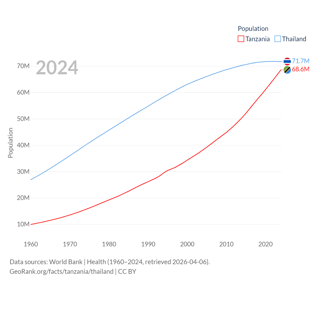 Tanzania has a population of 68.6M (ranked 22/197), compared with 71.7M in Thailand (ranked 20/197). Tanzania's land area is 342,009 sq mi versus 197,256 sq mi for Thailand (ranked 31st vs. 50th).