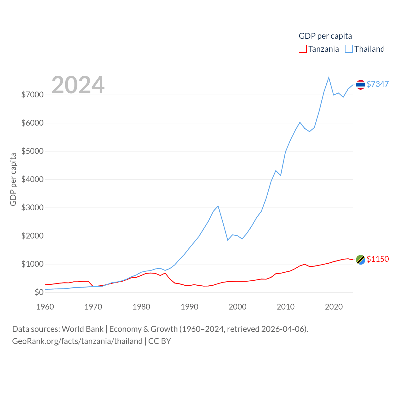 By GDP, Tanzania ranks 82/197 ($78.8B) and Thailand ranks 31/197 ($527B). By GDP per capita, Tanzania ranks 170/197 ($1,150), while Thailand ranks 100/197 ($7,347).