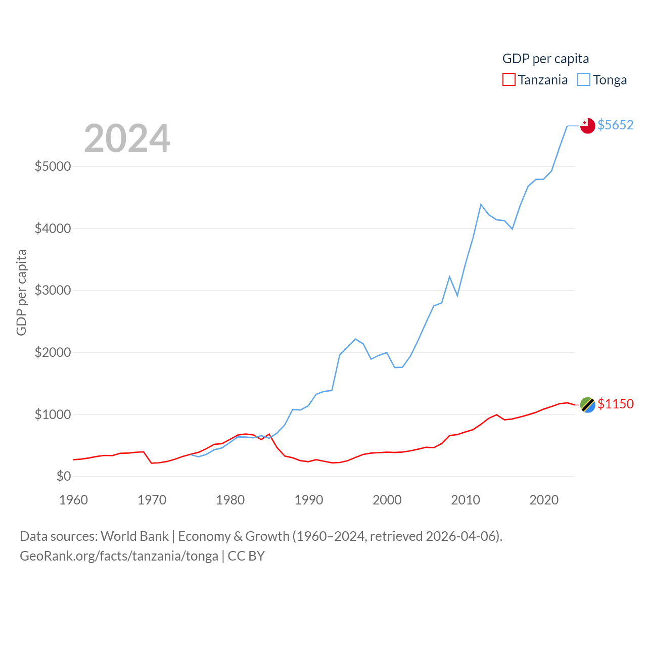 By GDP, Tanzania ranks 82/197 ($78.8B) and Tonga ranks 191/197 ($591M). By GDP per capita, Tanzania ranks 170/197 ($1,150), while Tonga ranks 115/197 ($5,652).