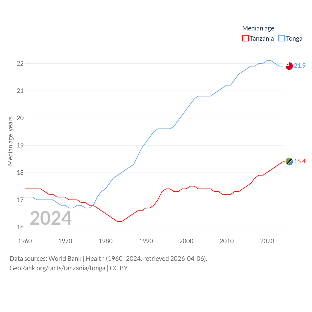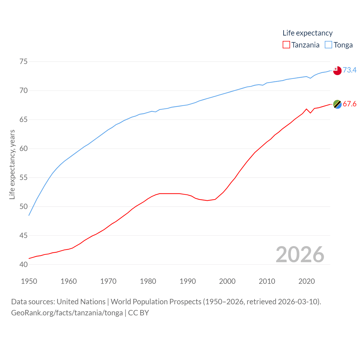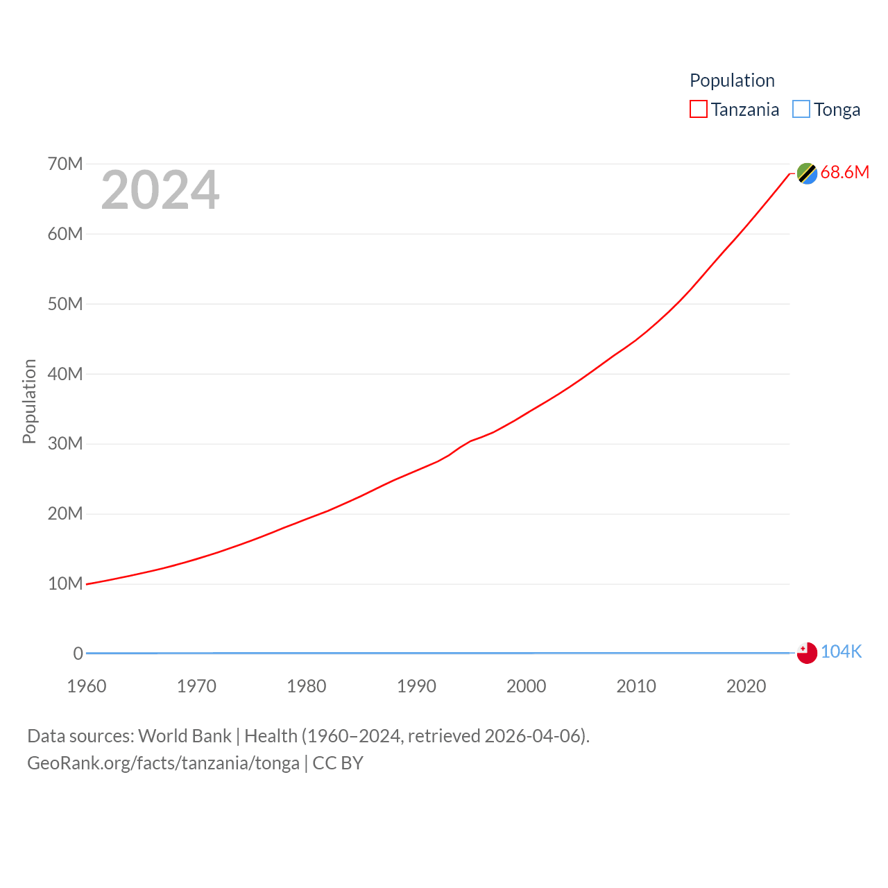 Tanzania has a population of 68.6M (ranked 22/197), compared with 104K in Tonga (ranked 183/197). Tanzania's land area is 342,009 sq mi versus 278 sq mi for Tonga (ranked 31st vs. 176th).