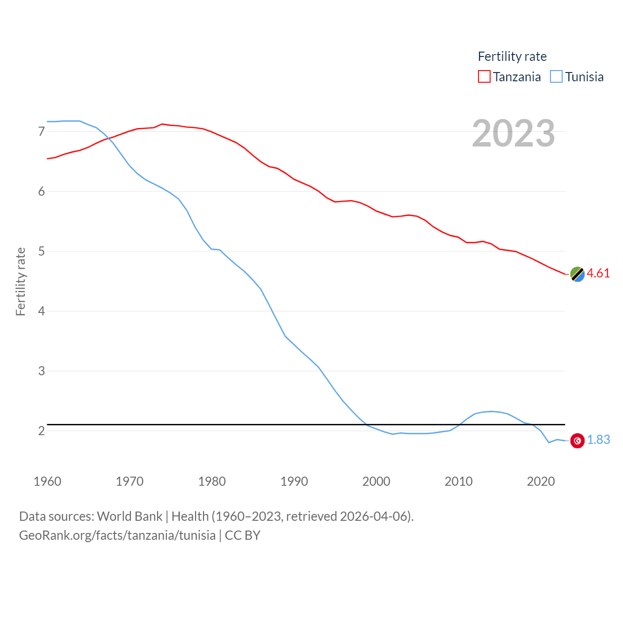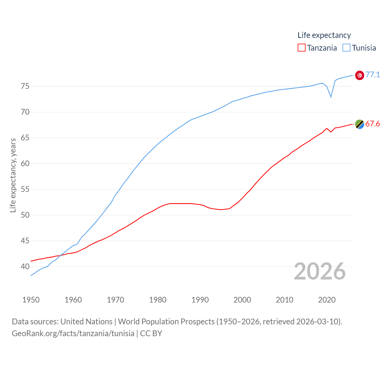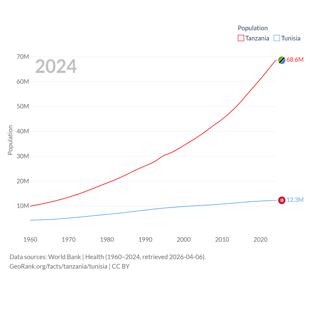 Tanzania has a population of 68.6M (ranked 22/197), compared with 12.3M in Tunisia (ranked 80/197). Tanzania's land area is 342,009 sq mi versus 59,985 sq mi for Tunisia (ranked 31st vs. 91st).