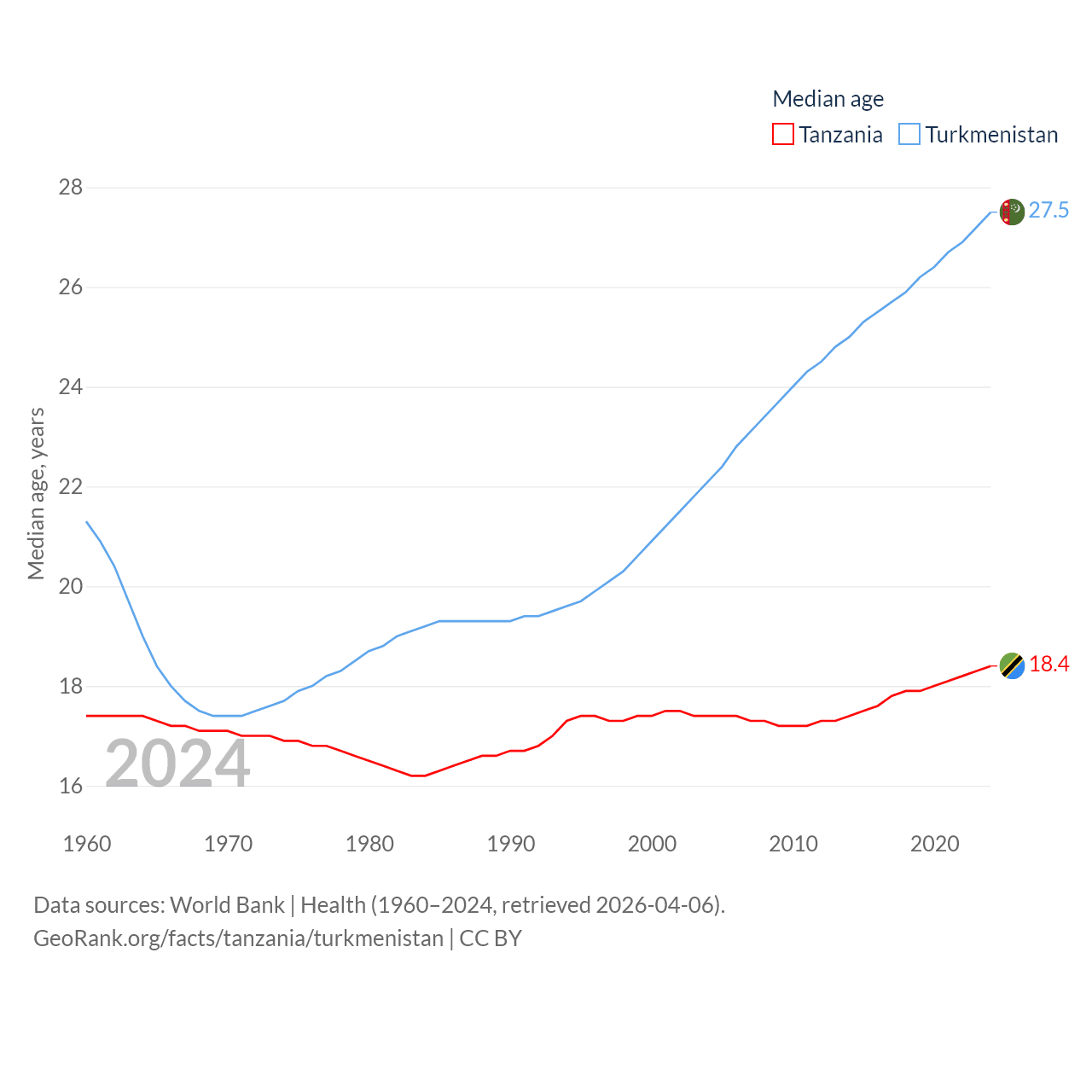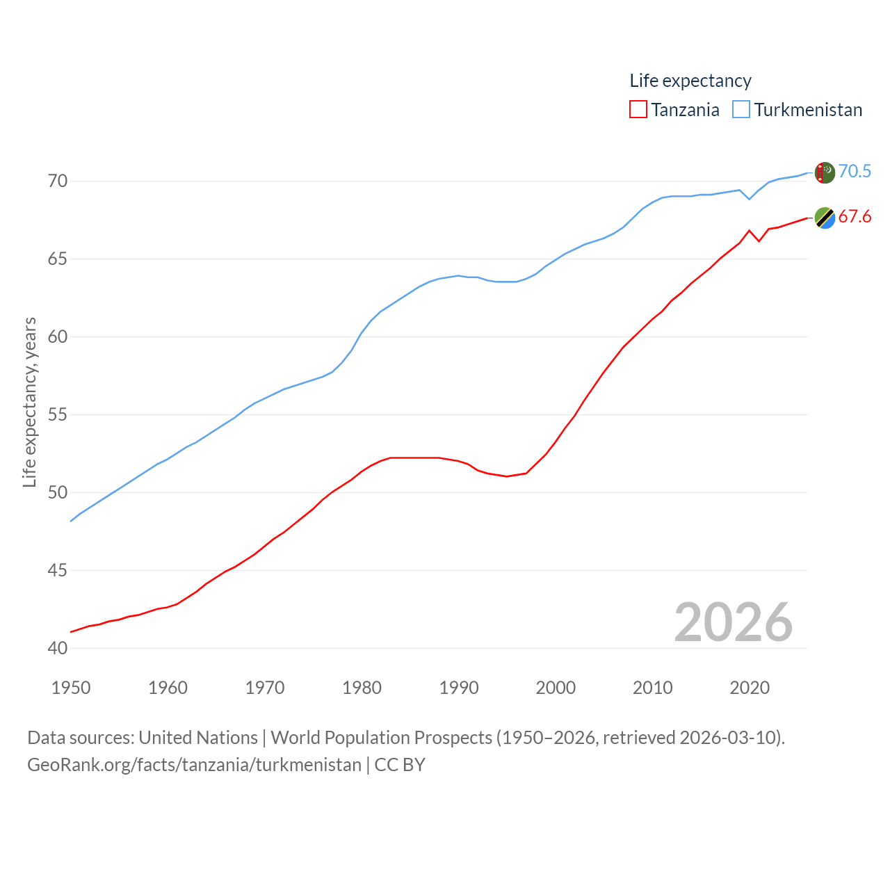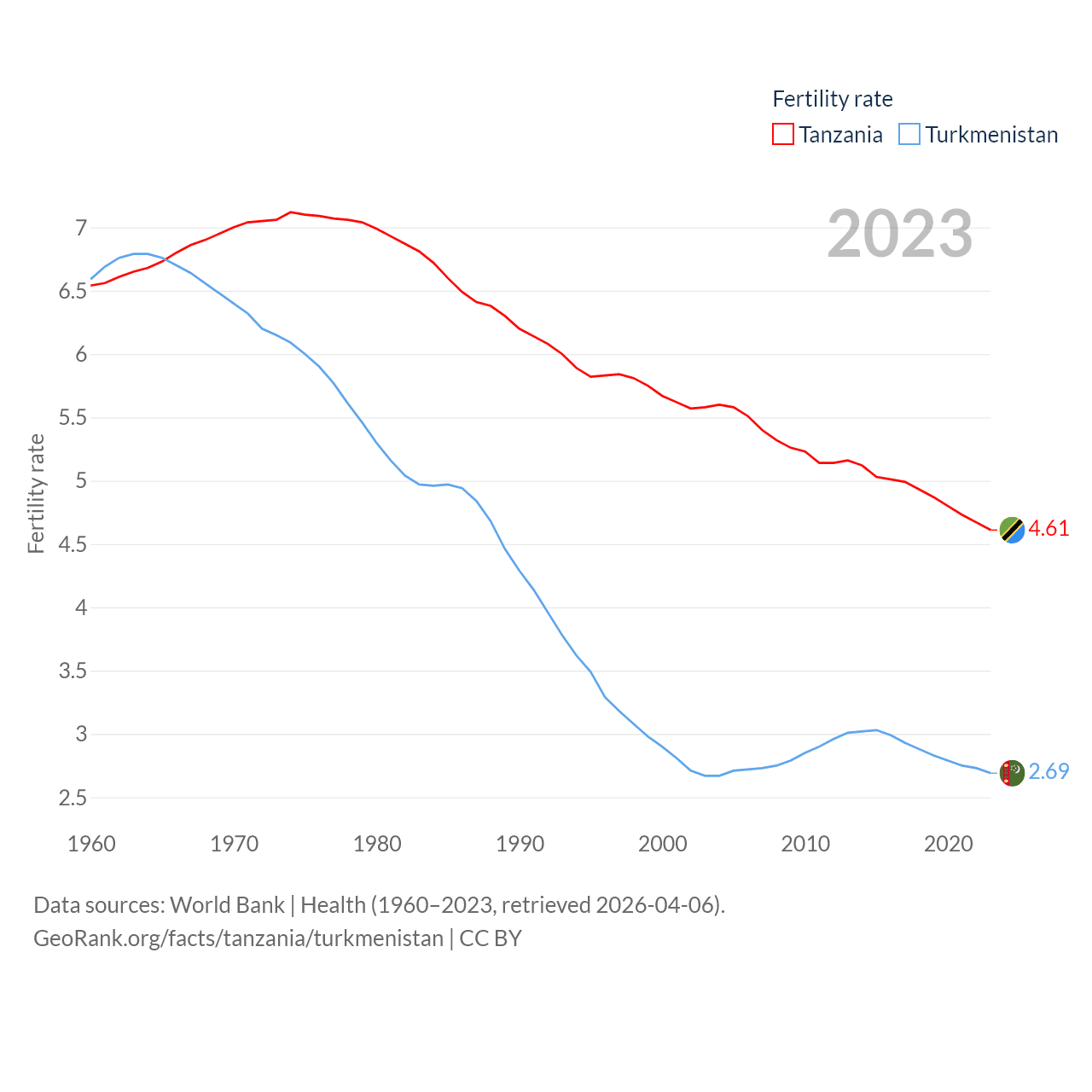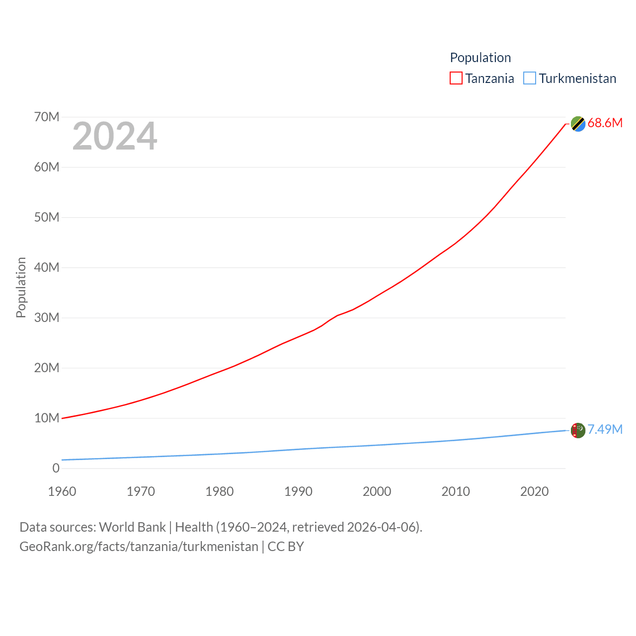 Tanzania has a population of 68.6M (ranked 22/197), compared with 7.49M in Turkmenistan (ranked 104/197). Tanzania's land area is 342,009 sq mi versus 181,441 sq mi for Turkmenistan (ranked 31st vs. 53rd).