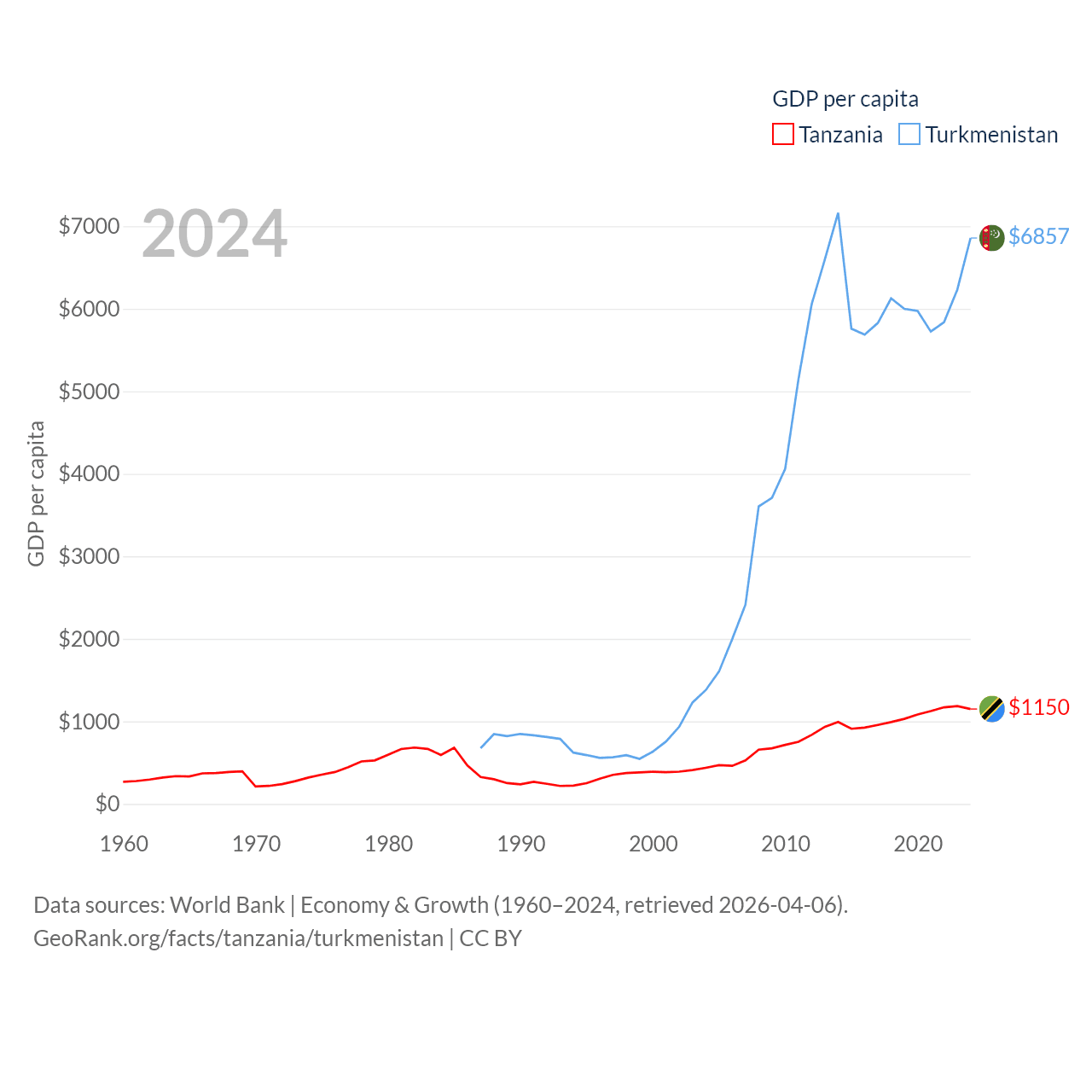 By GDP, Tanzania ranks 82/197 ($78.8B) and Turkmenistan ranks 92/197 ($51.4B). By GDP per capita, Tanzania ranks 170/197 ($1,150), while Turkmenistan ranks 104/197 ($6,857).