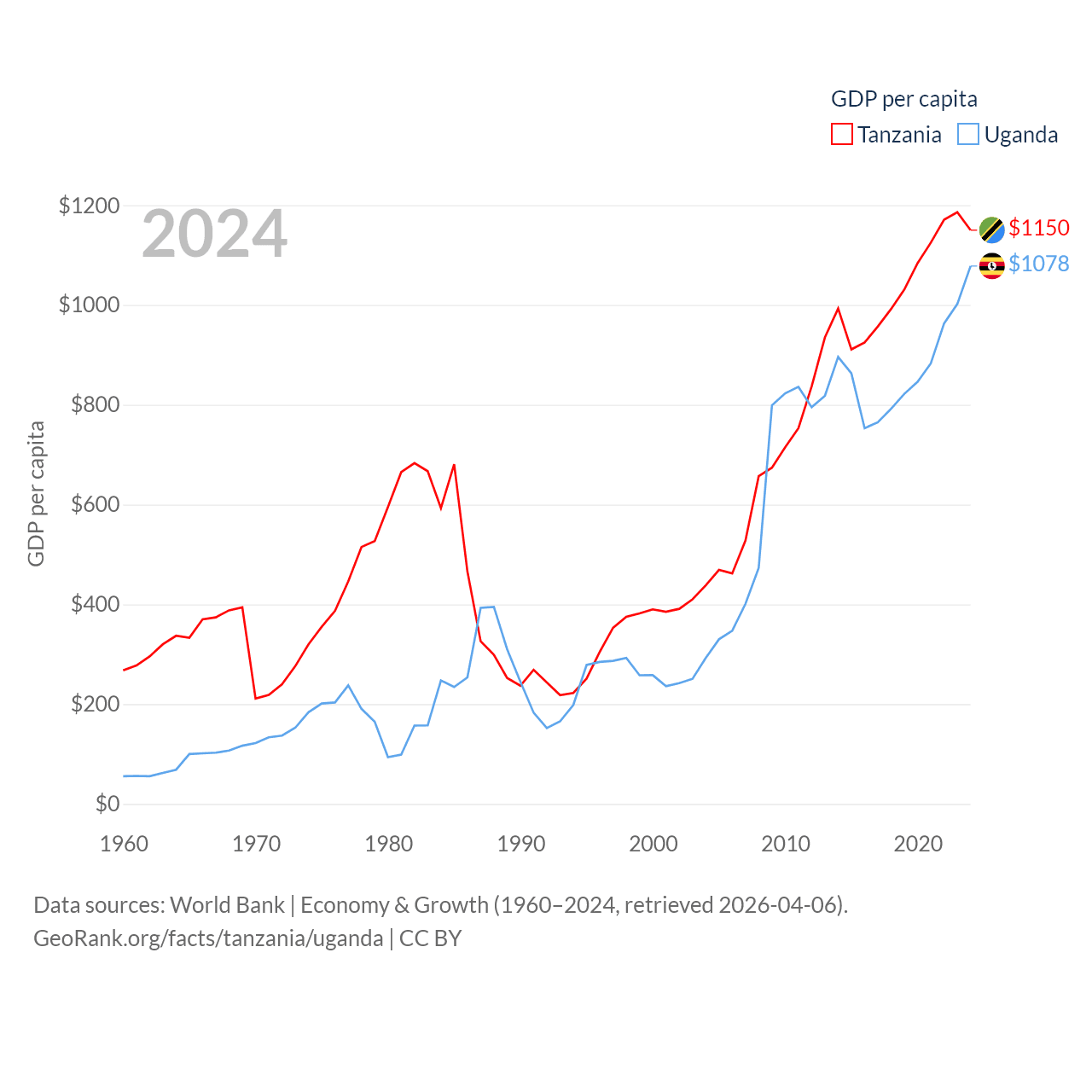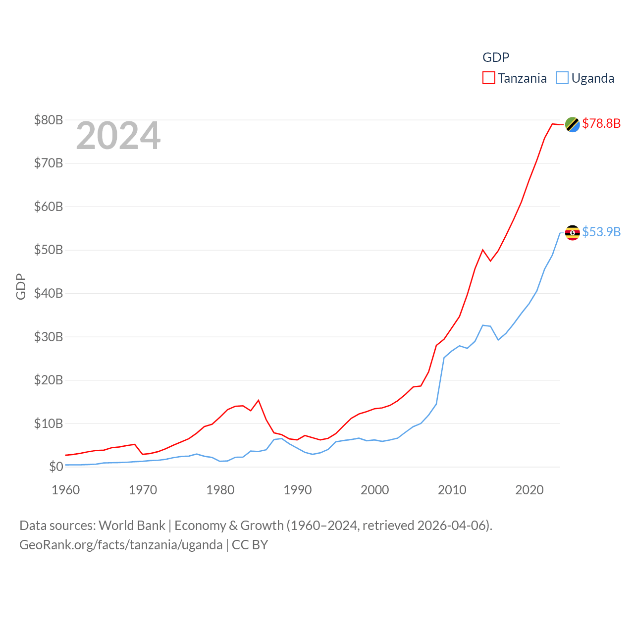 By GDP, Tanzania ranks 82/197 ($78.8B) and Uganda ranks 89/197 ($53.9B). By GDP per capita, Tanzania ranks 170/197 ($1,150), while Uganda ranks 176/197 ($1,078).