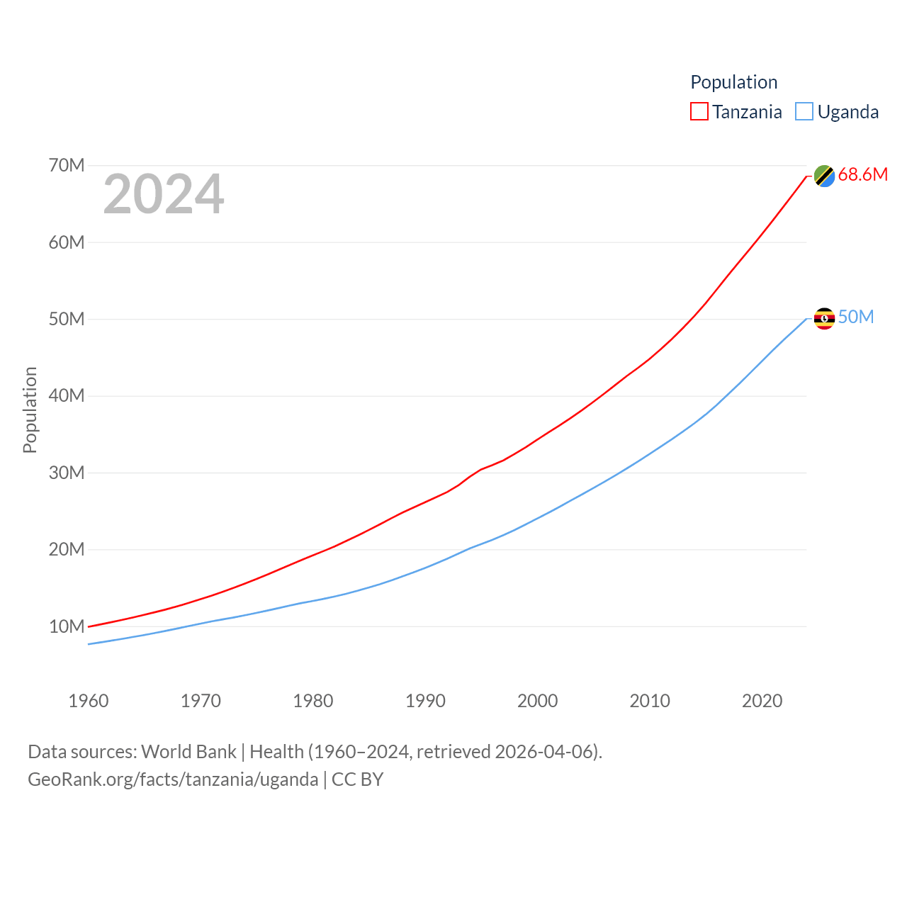 Tanzania has a population of 68.6M (ranked 22/197), compared with 50M in Uganda (ranked 31/197). Tanzania's land area is 342,009 sq mi versus 77,421 sq mi for Uganda (ranked 31st vs. 84th).