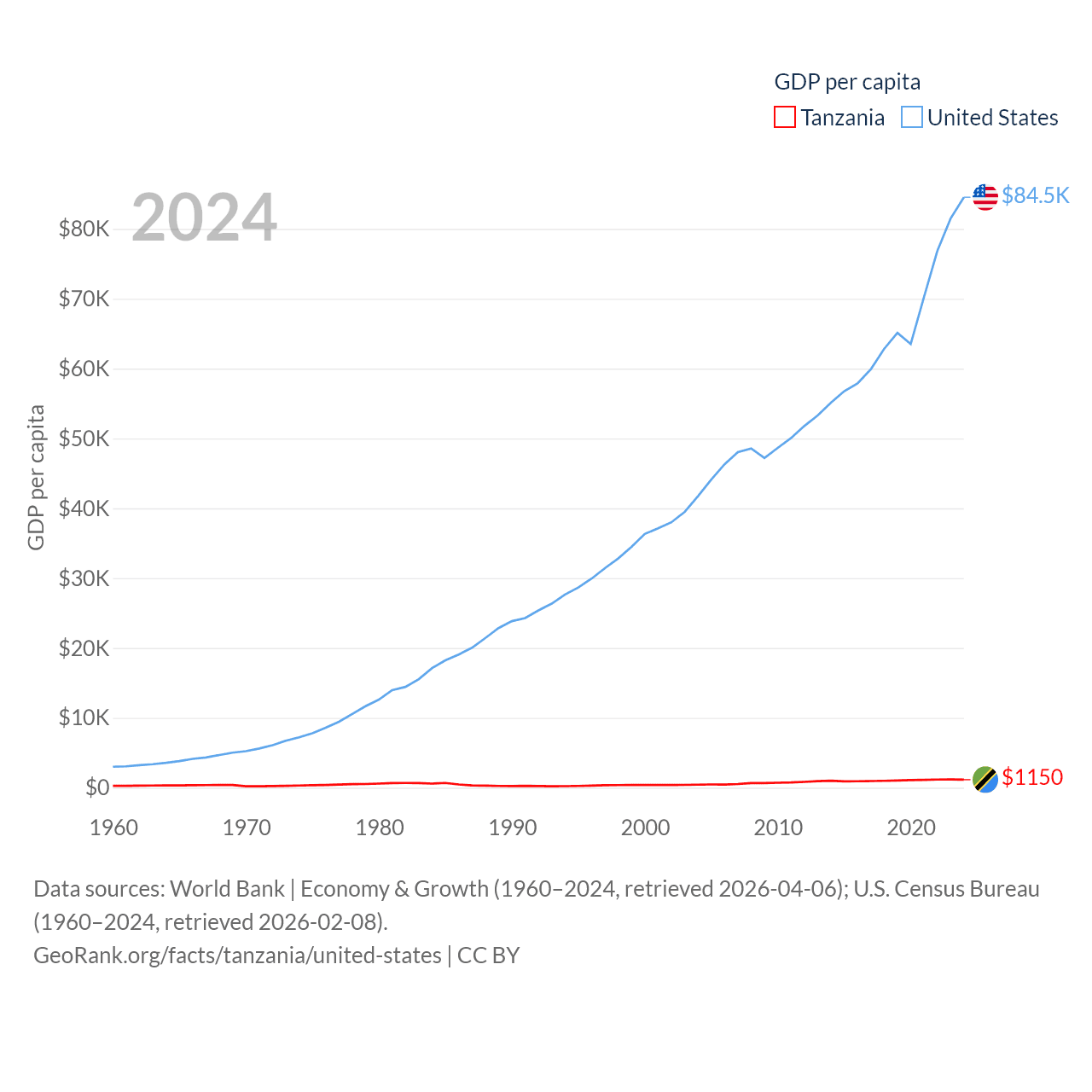 By GDP, Tanzania ranks 82/197 ($78.8B) and The United States ranks 1/197 ($28.8T). By GDP per capita, Tanzania ranks 170/197 ($1,150), while The United States ranks 10/197 ($84,534).