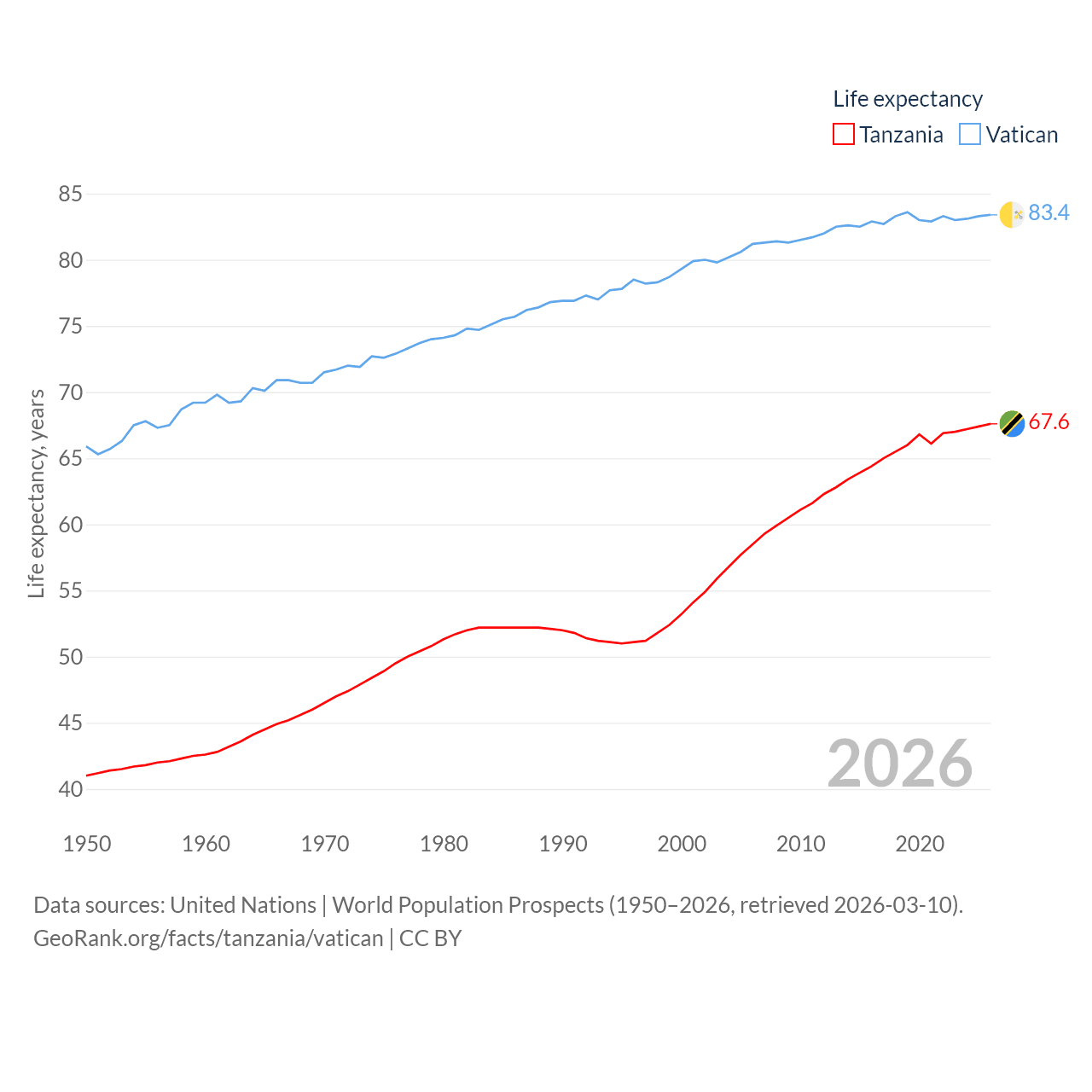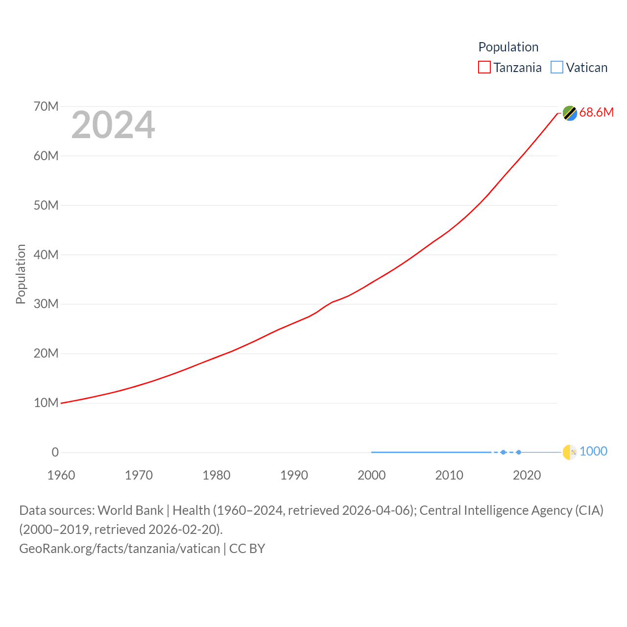 Tanzania has a population of 68.6M (ranked 22/197), compared with 1K in The Vatican (ranked 197/197). Tanzania's land area is 342,009 sq mi versus 0.17 sq mi for The Vatican (ranked 31st vs. 197th).